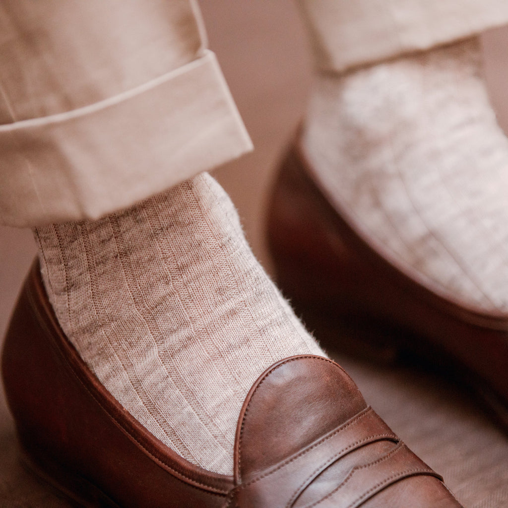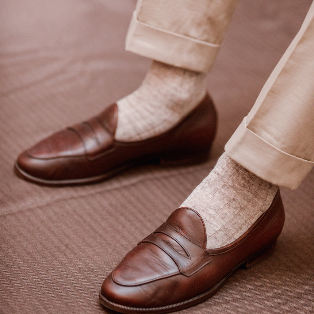 Diese mittelhohen Socken aus cremefarbenem Leinen sind das perfekte Frühjahrs- und Sommeraccessoire für jeden Mann, der seine Füße kühl und trocken halten möchte. Ihre Farbe ermöglicht es Ihnen, sie zu einer Vielzahl von Sommeroutfits zu tragen.