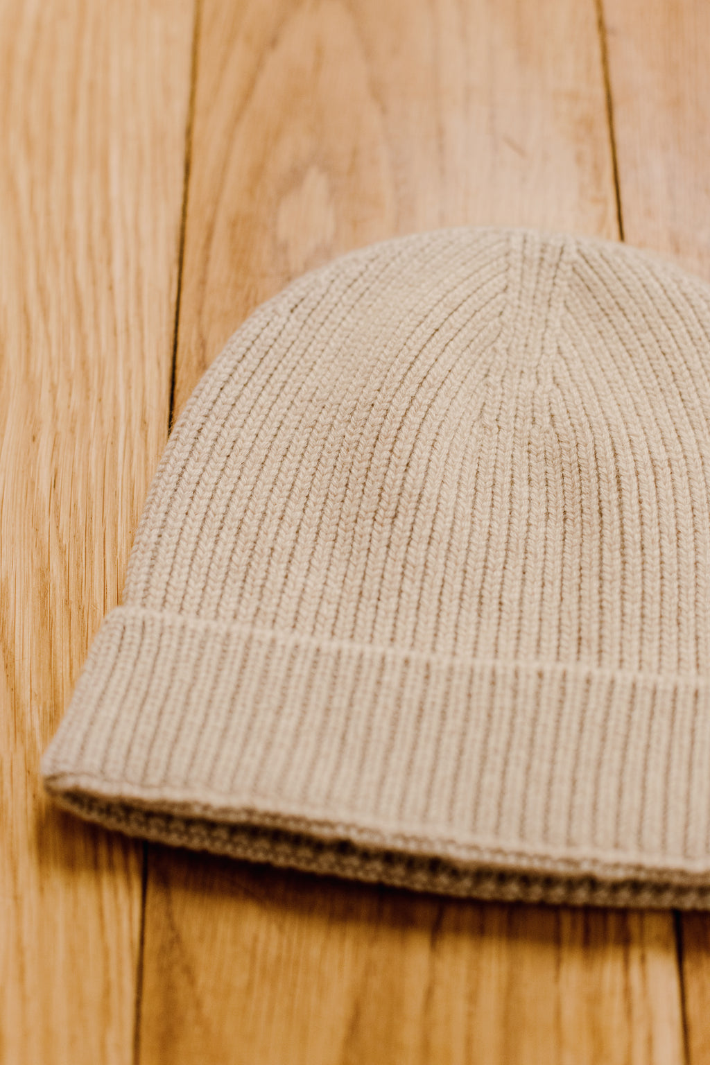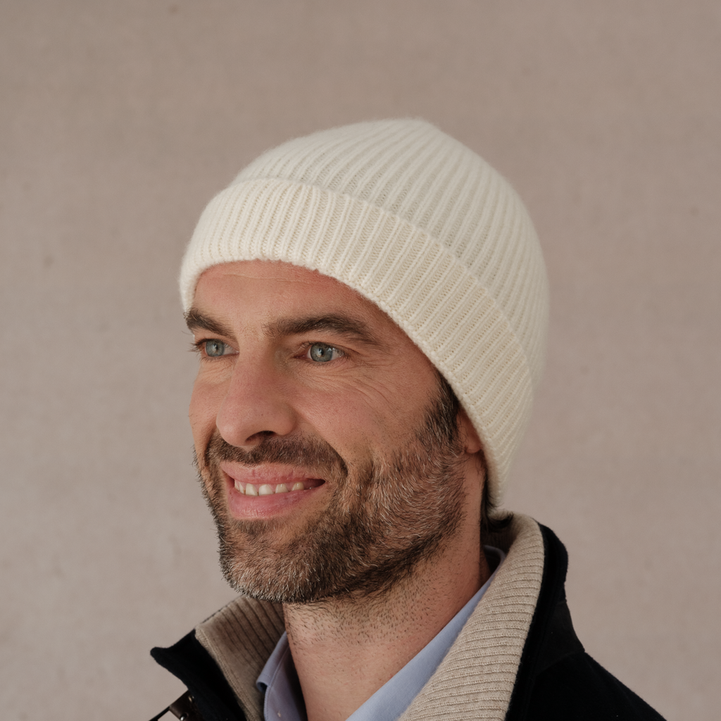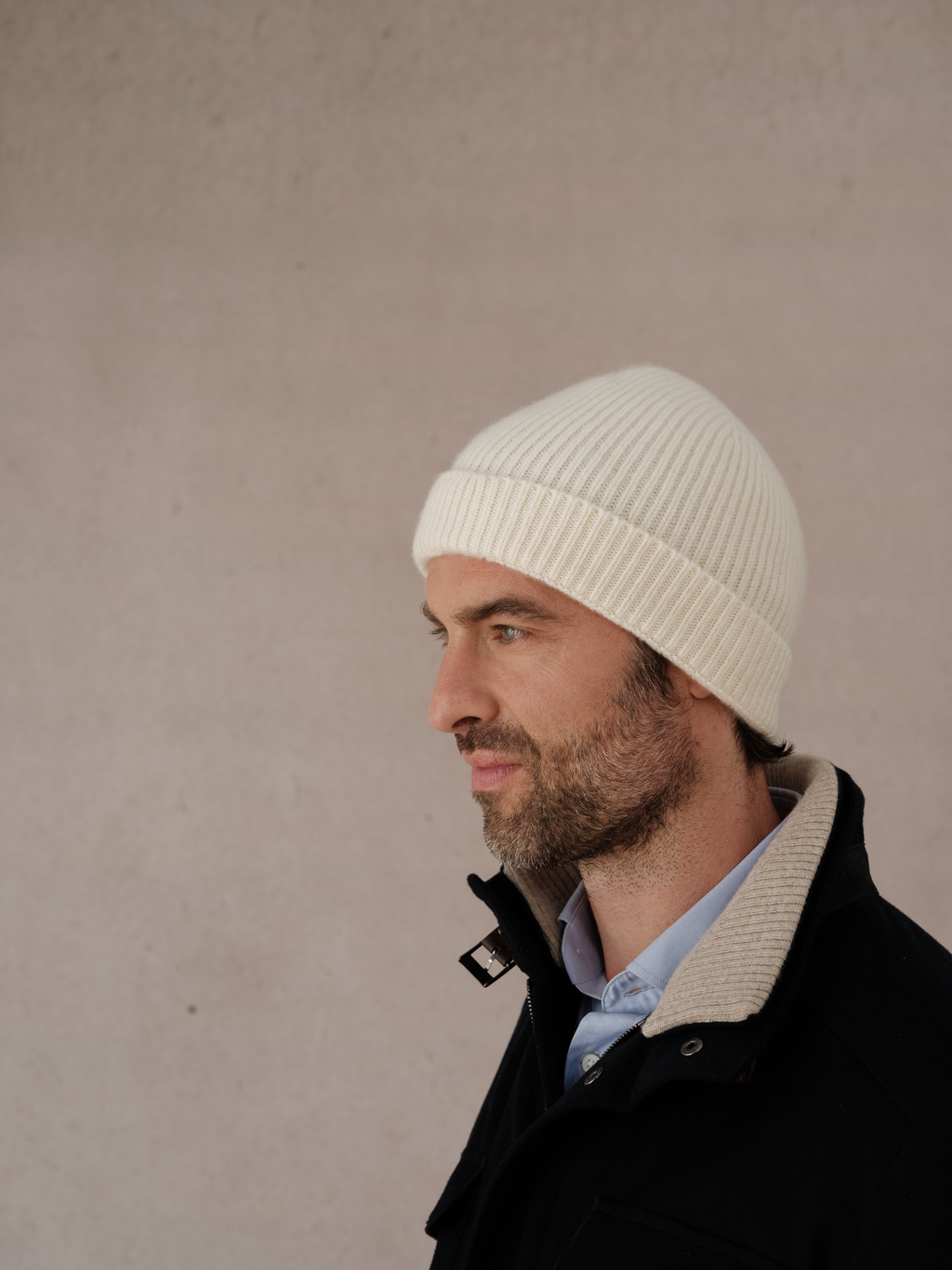 Die elfenbeinfarbene Mütze Mazarin besteht aus 100% Kaschmir.