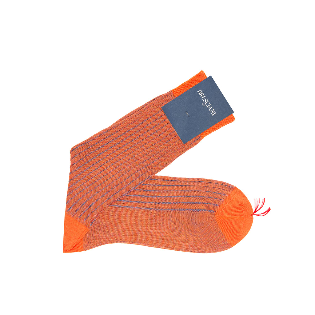 Sehr schöne plattierte Socken in orange mit blauen Streifen. Diese Socken in Grundfarbe orange haben sehr kontrastierende Farben. Sie sind die farbenprächtigsten, plattierten Socken im Bresciani-Sortiment. 100% Baumwolle.