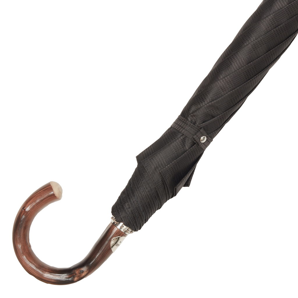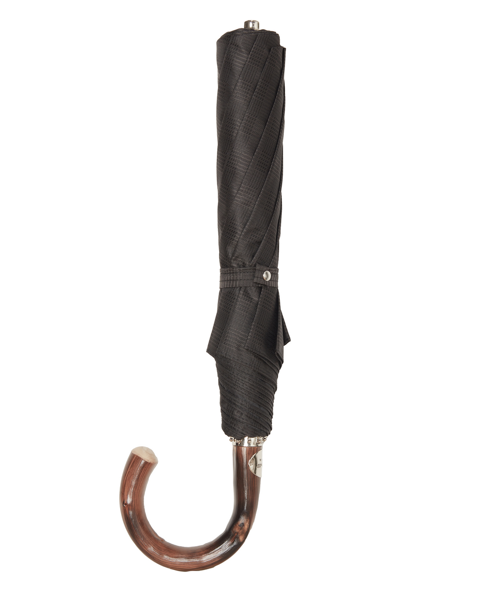 Der schwarze Stoff dieses Regenschirms ist sehr subtil: Hinter der dunklen Farbe ist das feine Gittermuster des Prince of Wales zu erkennen. Ein raffiniertes Muster, das Hahnentritt und Karos miteinander verbindet und diesem Modell einen besonderen Charakter verleiht.