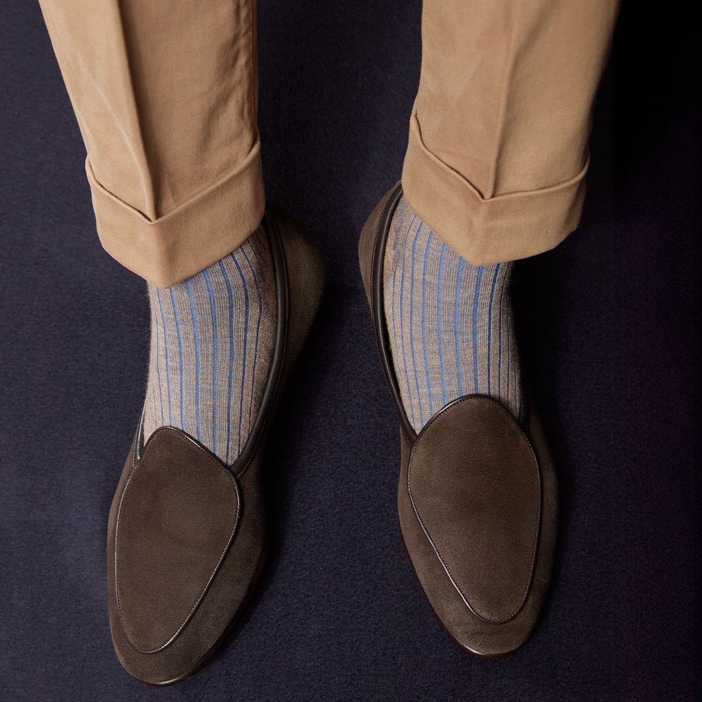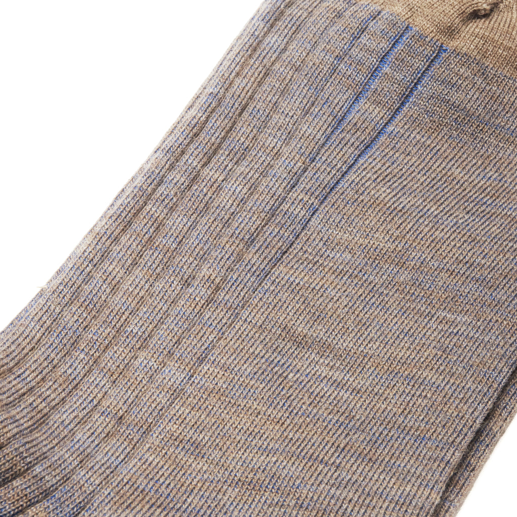 Break away from the trend of dark wool socks with this pair of beige and royal blue wool knee-high socks. This elegant model goes perfectly with shoes in light or slightly darker shades of brown, burgundy, blue or even white.