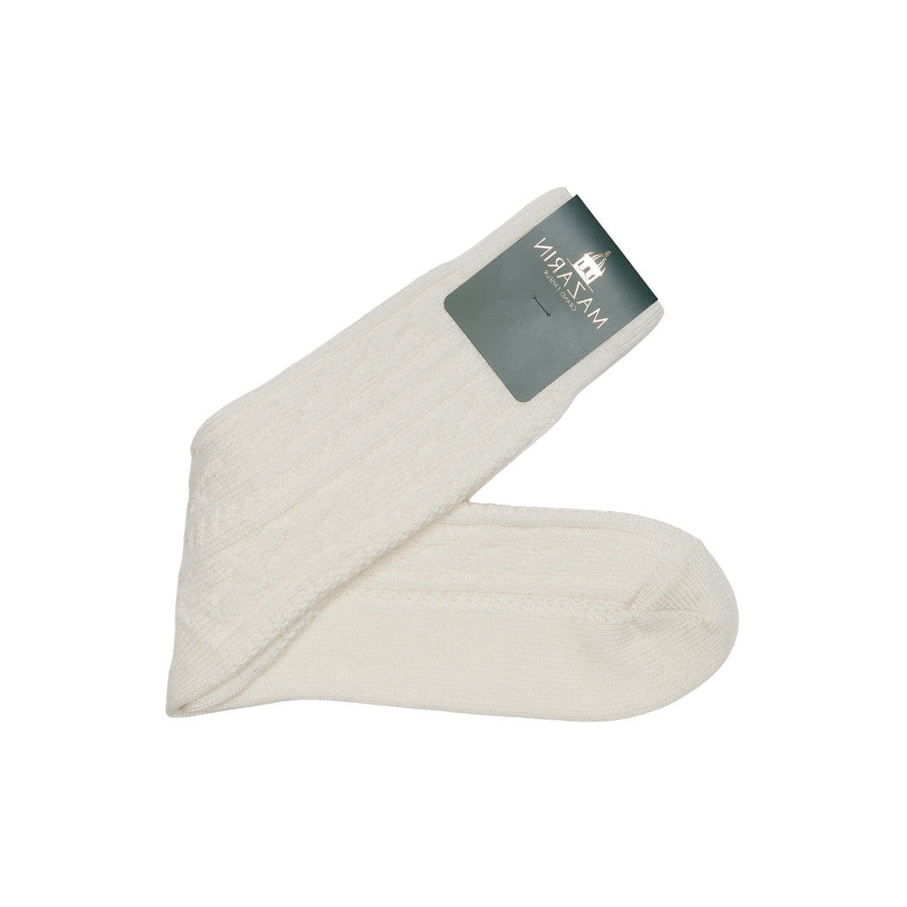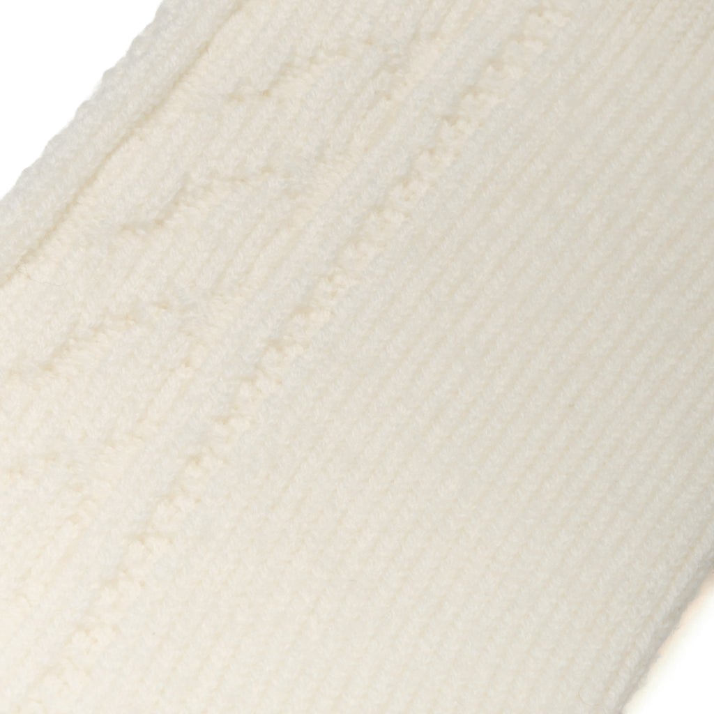 Soft and luminous, the cream white shade gives these socks a refined and cozy look. The cable knit pattern adds elegant texture, enhancing the knit without overdoing it.