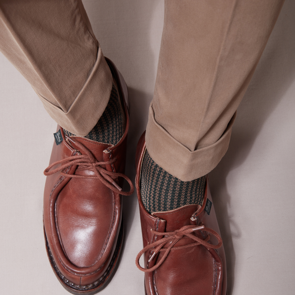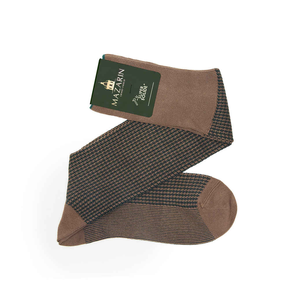 Discover these elegant knee-high socks. This original model features a houndstooth pattern in cinnamon brown and academy green. You can easily wear this refined pair with beige, brown or green pants and brown shoes.