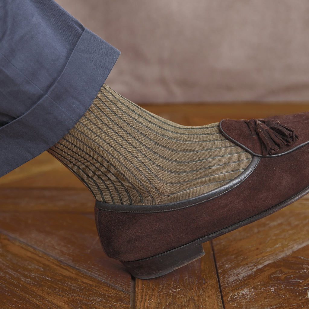 Mid-calf socks in a copper yellow cotton lisle yarn, with subtle academy green stripes from the brand Mazarin .