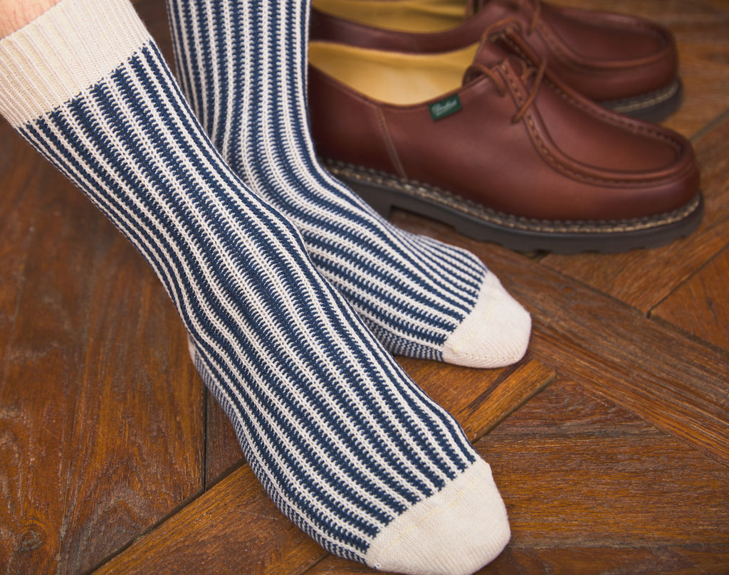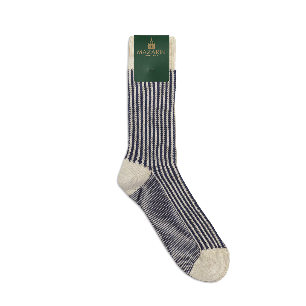 Discover our pair of short cotton socks with a blue and beige deckchair vertical stripe pattern. This men's model is decidedly casual and goes easily with chinos or jeans. The vertical stripes, knitted in relief, bring a unique touch of originality.