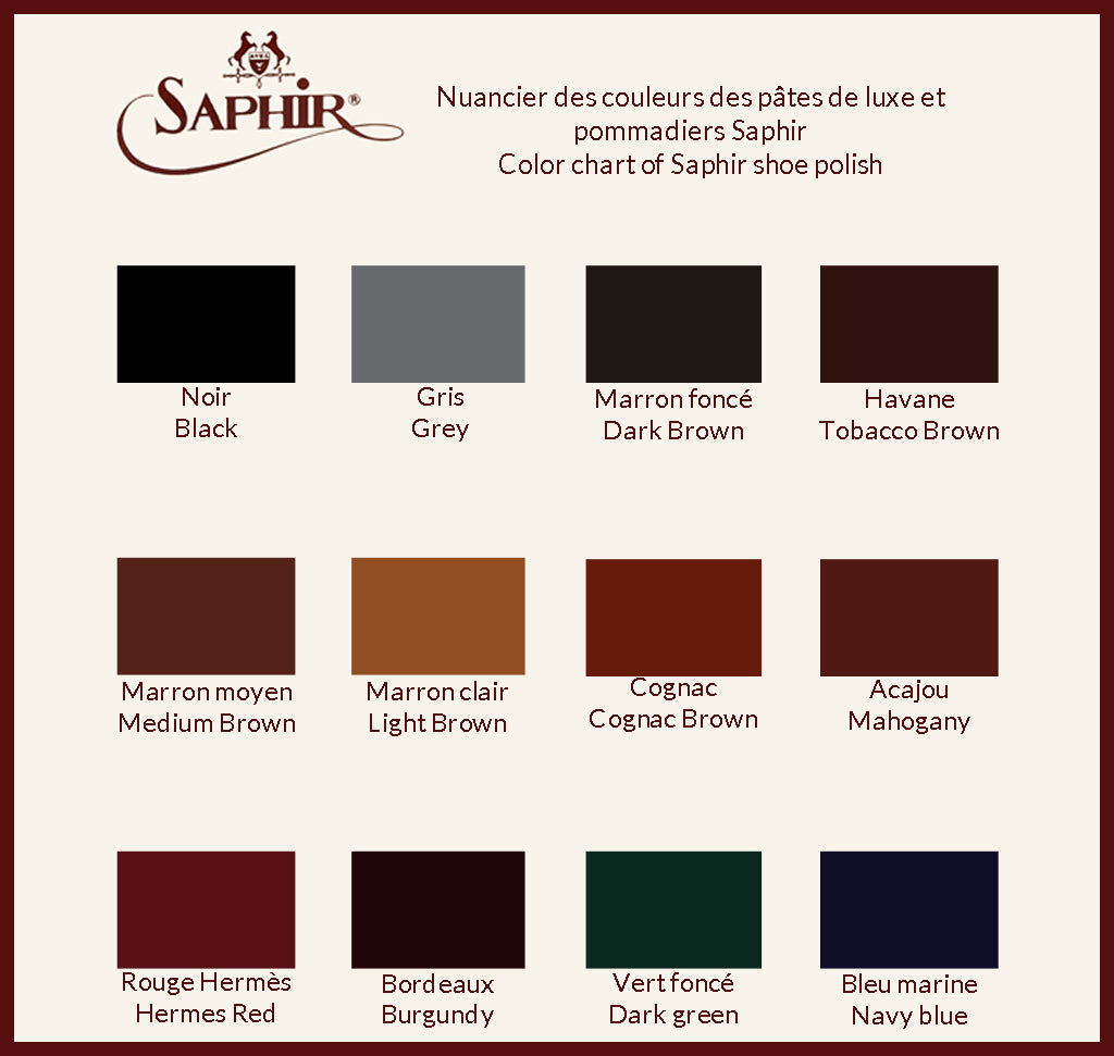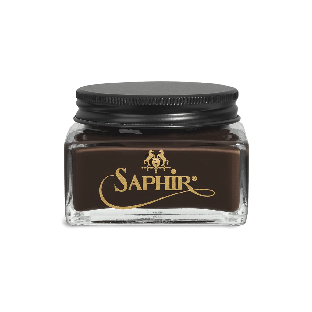 Saphir wax polish, known as "Pate de Luxe", is also a blend of oils and natural waxes. You can apply it with a brush to protect the leather from water and other damages, and to shine your shoes. It is the main product required to make a mirror shine, or enhance your shoes with different shades.