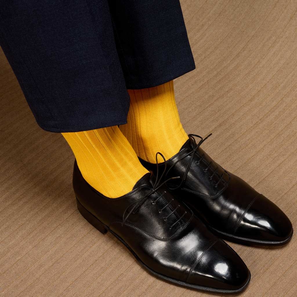The shade of yellow of these socks is bright and lively, allowing you to add a touch of colour to your outfit. Wear them with light-coloured trousers, especially beige, to bring out the colour and give your outfit a summery touch! Or, if you really want to catch everyone's attention, dare to combine them with coloured trousers (red, green, blue, grey) to bring out the contrasts (always with elegance!).