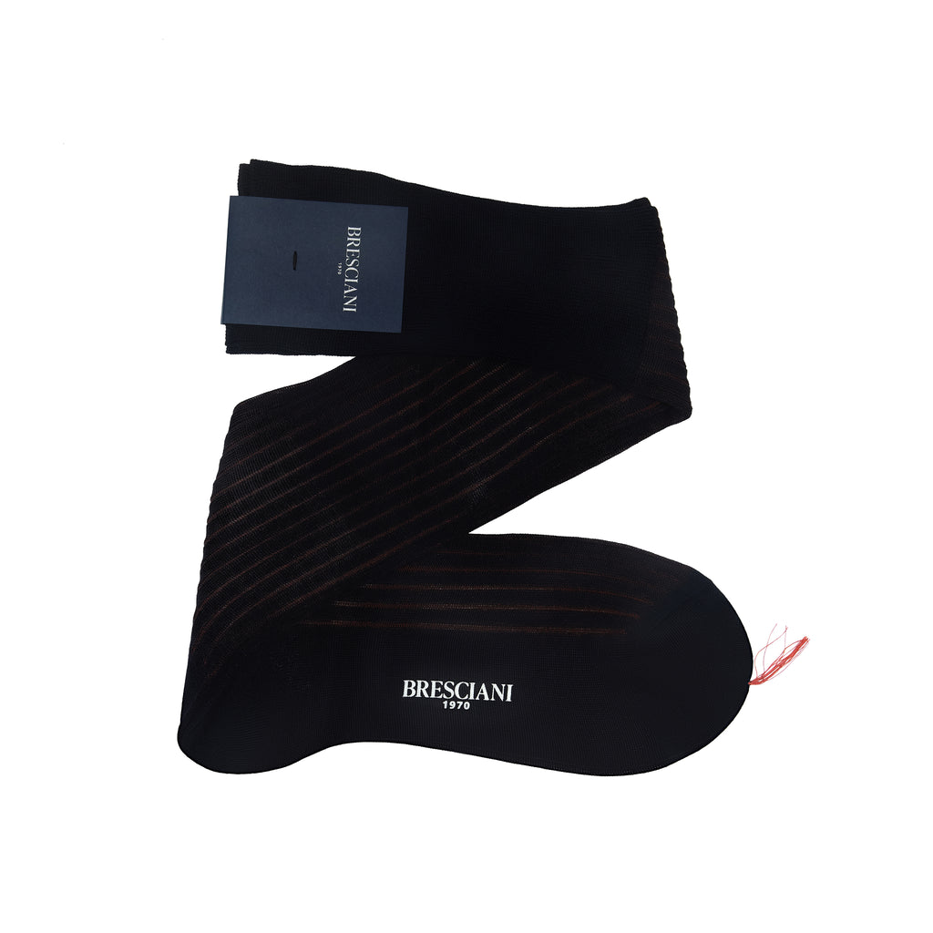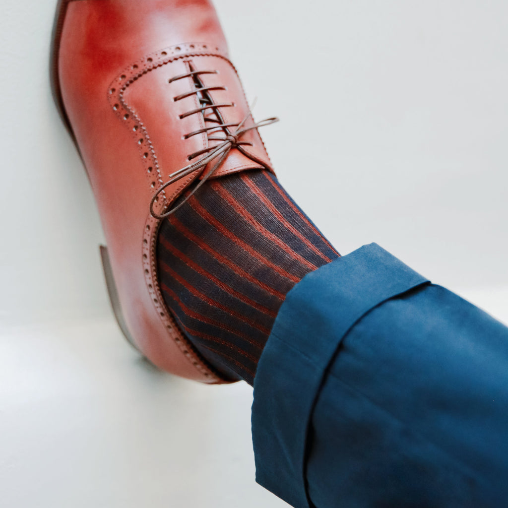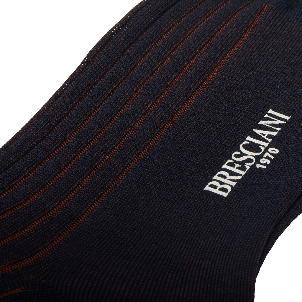 These socks in 100% cotton lisle are designed by the brand Bresciani and made in Italy. Offering a very elegant blend of navy blue and copper, these knee-high socks will look great with brown shoes, a navy suit or jeans.