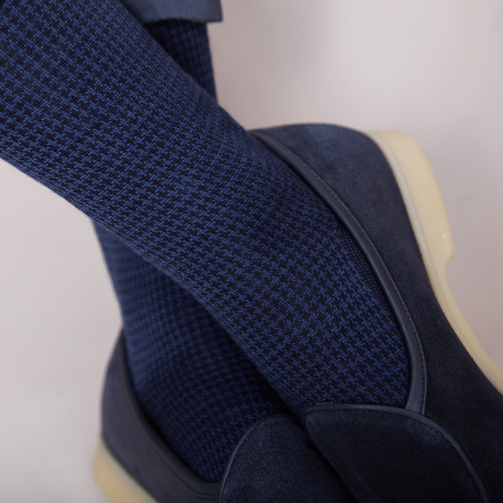 This elegant knee-high style is ideal for introducing discreet houndstooth into a formal outfit. This normally more striking pattern is here made up of two dark colors which go easily with navy blue or midnight blue pants and black shoes.
