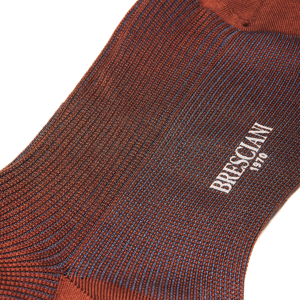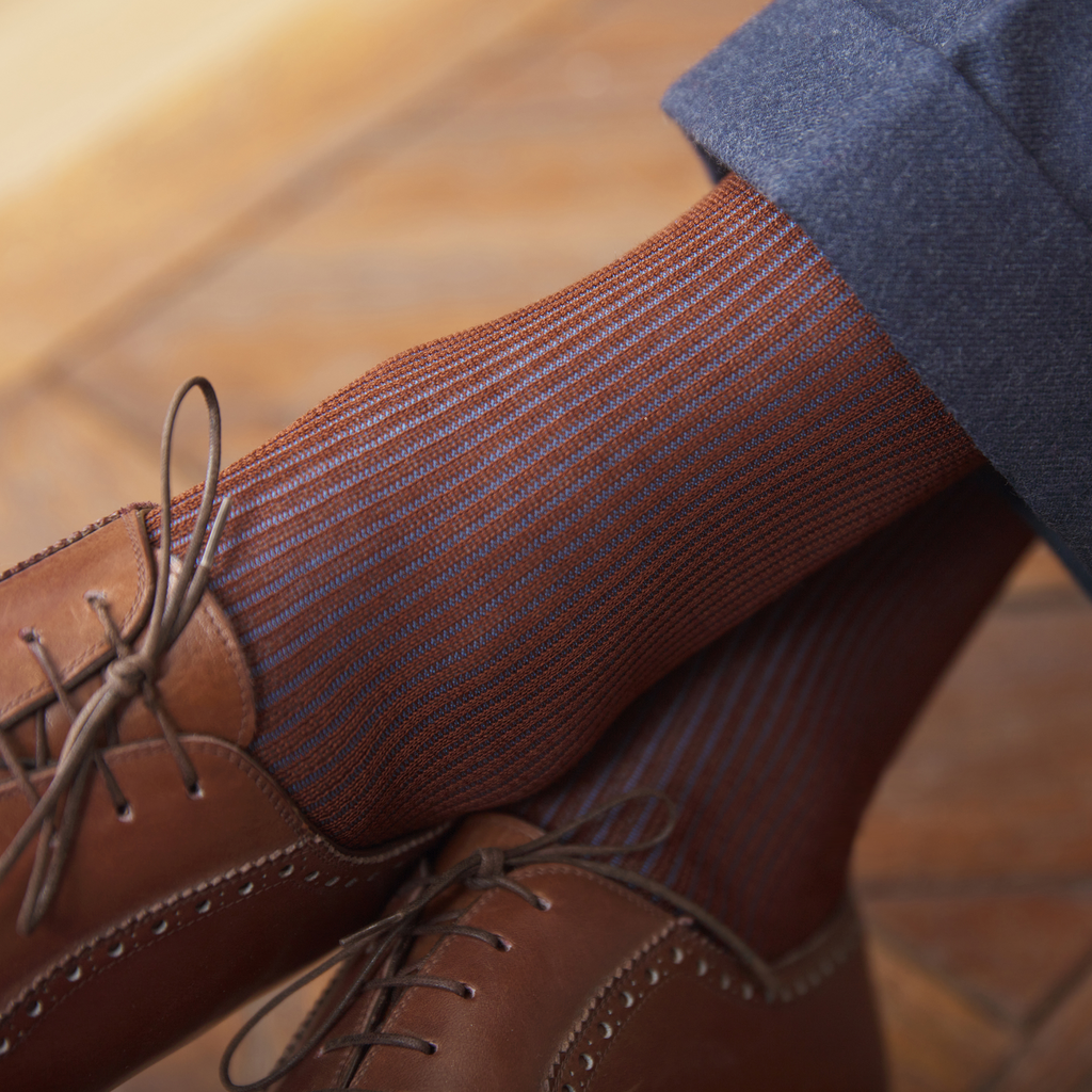 Try these hazel brown socks with sky blue stripes in pure lisle yarn, by Bresciani.