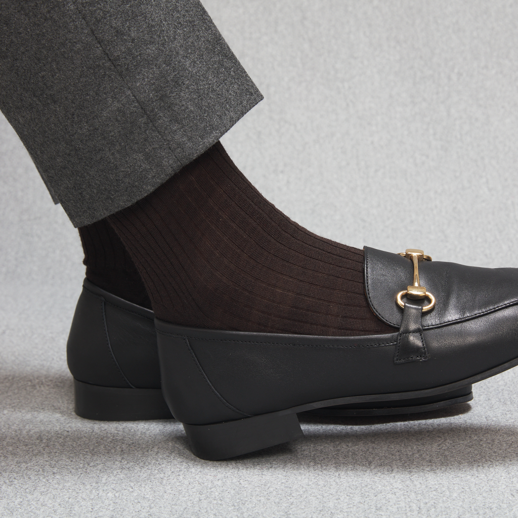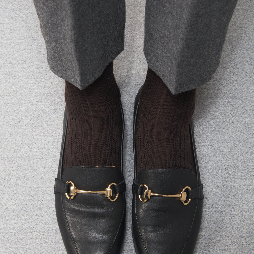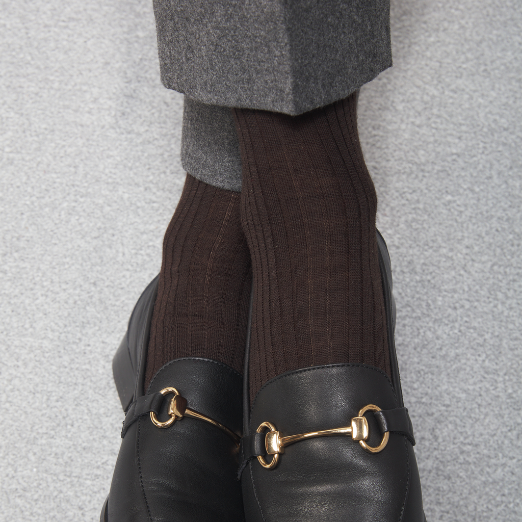 This pair of elegant and timeless wool socks comes in a deep and refined dark brown shade. Mid-calf length, it combines the softness and finesse of wool with its natural insulating properties, ensuring warmth and comfort throughout winter days.