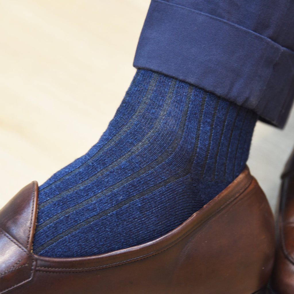 Try this pair of navy blue & khaki mid-calf socks in linen & cotton from the French brand Mazarin!
