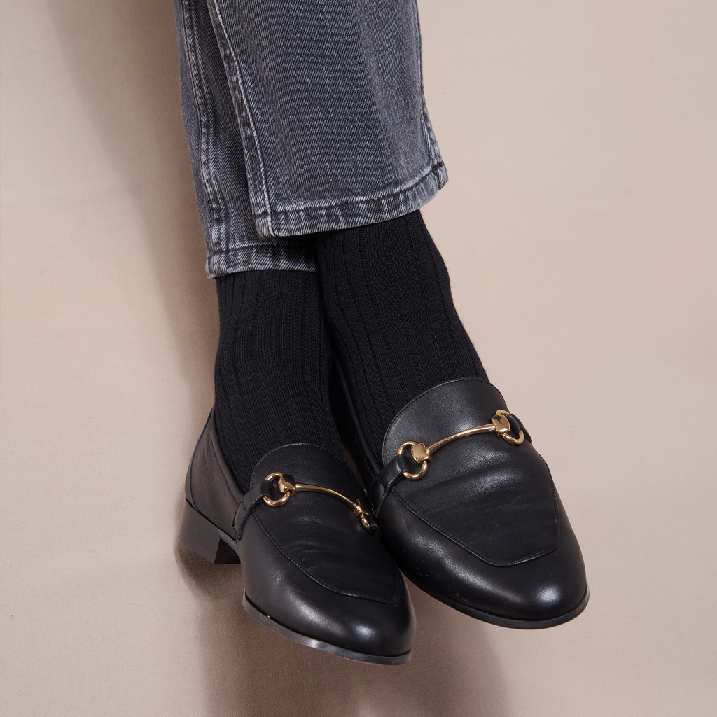 Mid-calf black socks in Super-durable Merino wool. Women's model by Mazarin.