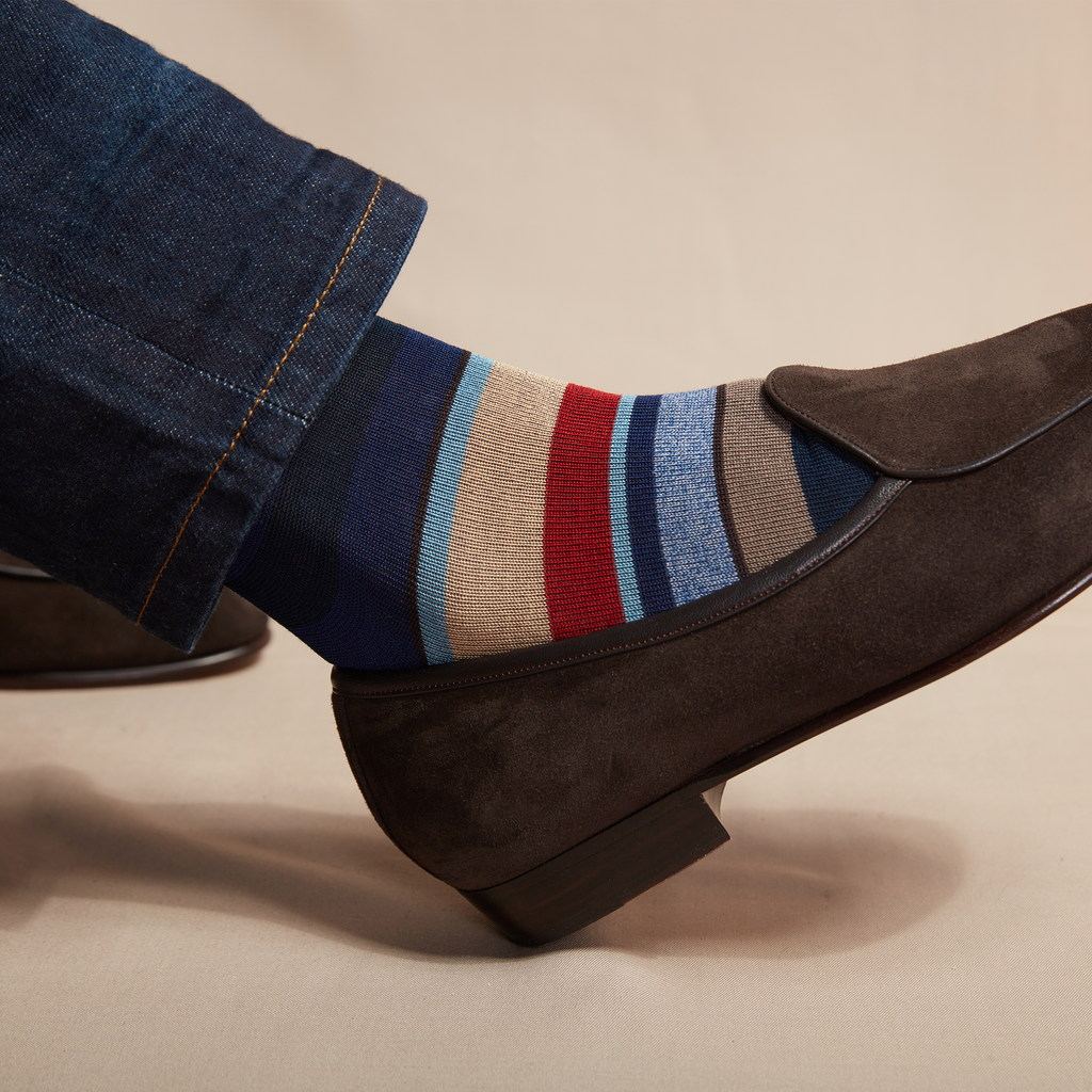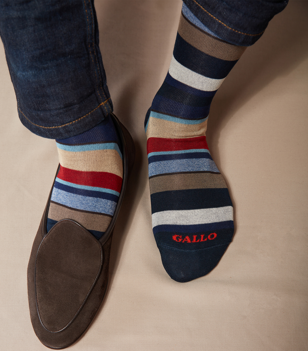 High cotton socks from the Gallo brand with an original and vintage pattern of multicolored horizontal stripes.