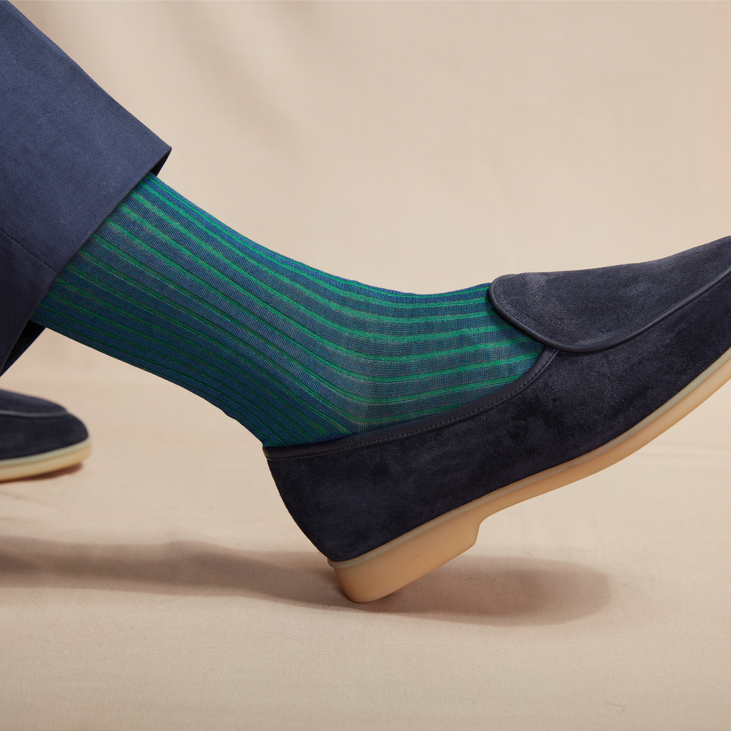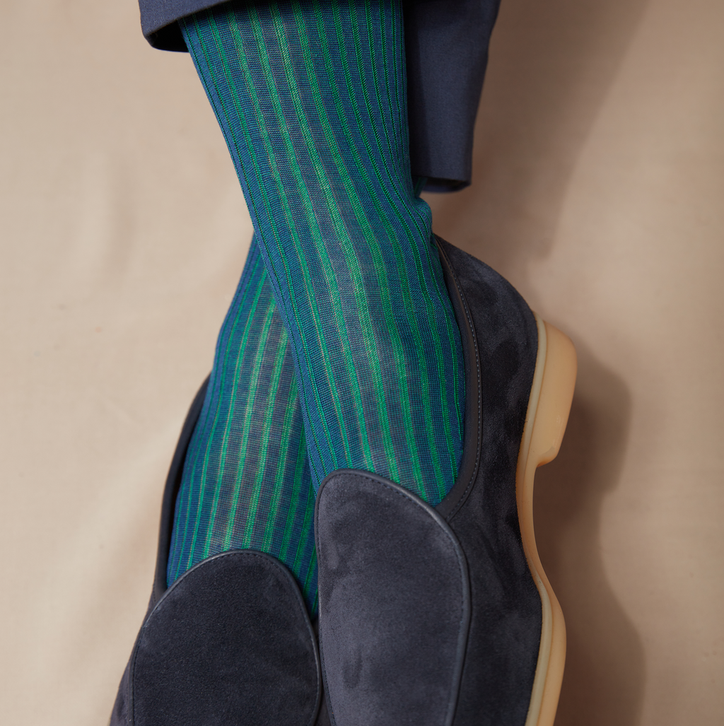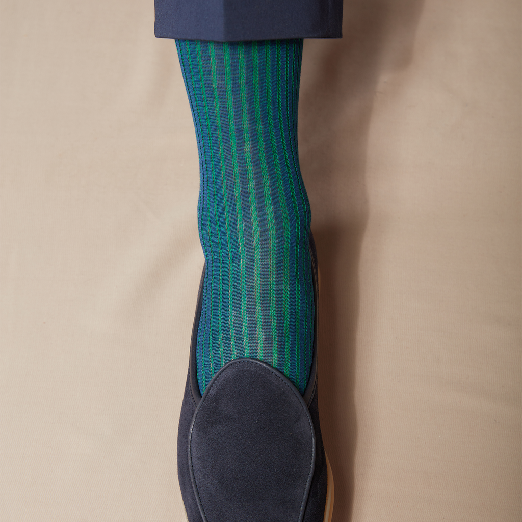 Discover this refined pair of high vanised socks in pure midnight blue lisle yarn with green stripes, by Gallo.