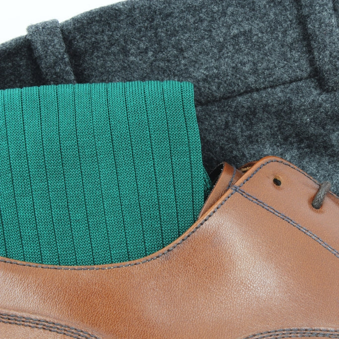 Emerald green socks enjoy a special reputation. These socks have their aficionados and rightly so. These green socks offer an alternative to academy green because pine green is lighter. Some would be tempted to say that they are less dressed. Without judging, these green socks may just be less academic, but just as beautiful. Green socks allow you to combine several colors. For example, they allow a clever transition from gray or navy blue to brown, from pants to shoes. They disperse attention, thus enhancing the whole. You can of course choose to wear them with tone-on-tone pants and shoes, whether brown on brown or navy blue on black. In this case, green socks will decide. You will thus put them forward.