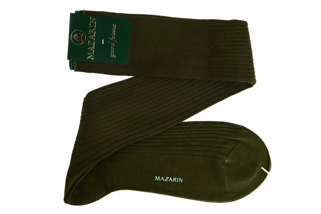 These knee-high socks from the brand Mazarin feature a sumptuous khaki green colour. They are made in Italy out of 100% cotton lisle. These socks feature a seamless toe-linking to avoid a central seam at the toes and they are reinforced at the toe and heel.
