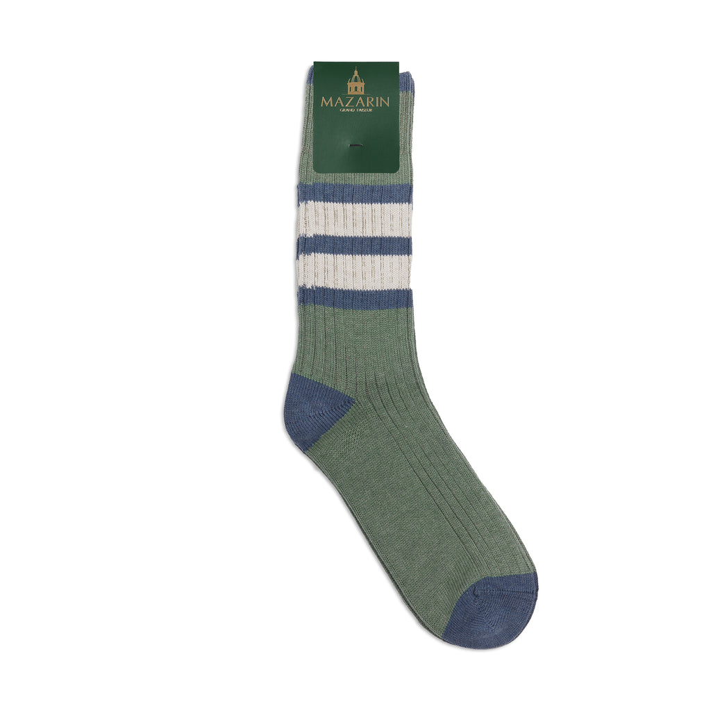 Casual khaki green cotton socks featuring a navy and white striped pattern by Mazarin.