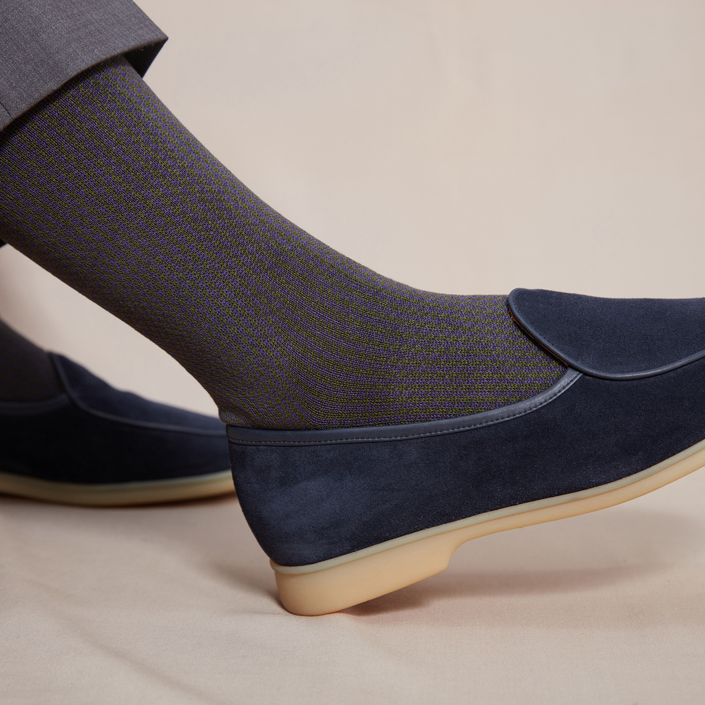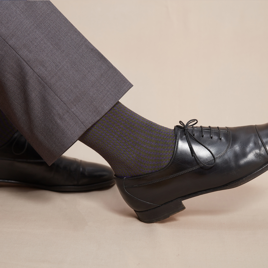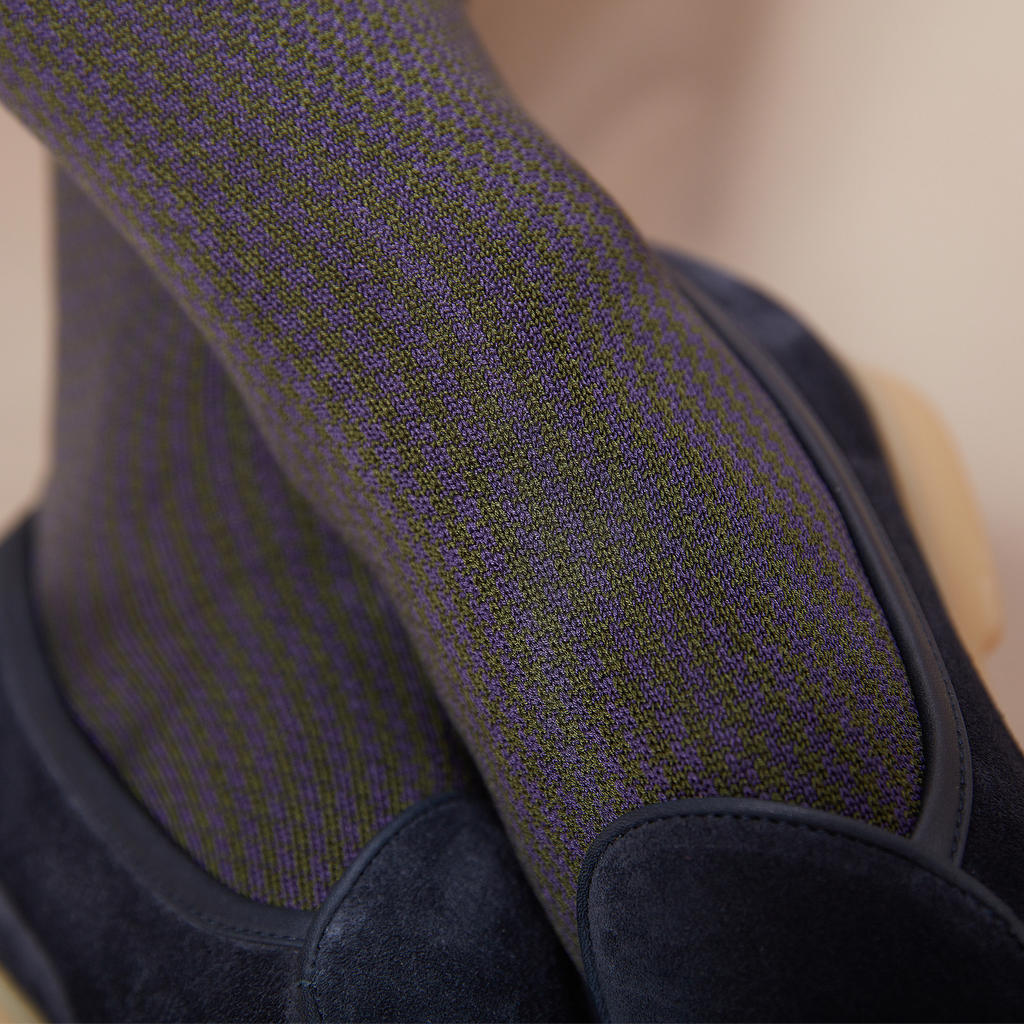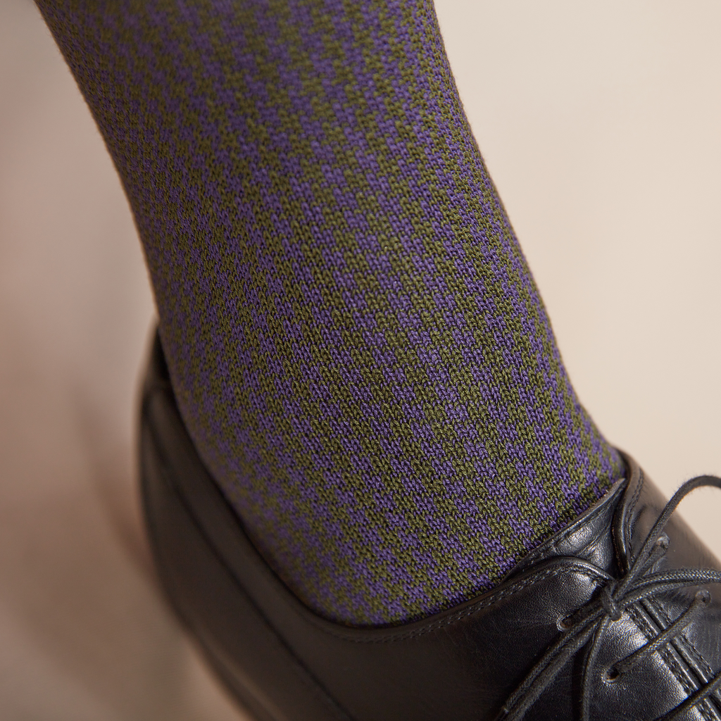 This original model of mid-calf socks in super-strong Cotton lisle goes perfectly with a dark outfit to enhance the whole outfit with color. The houndstooth pattern is a strong pattern. Here it is composed of khaki green and purple for an original result.
