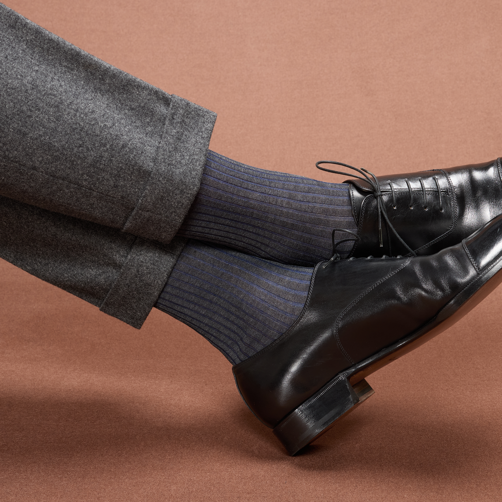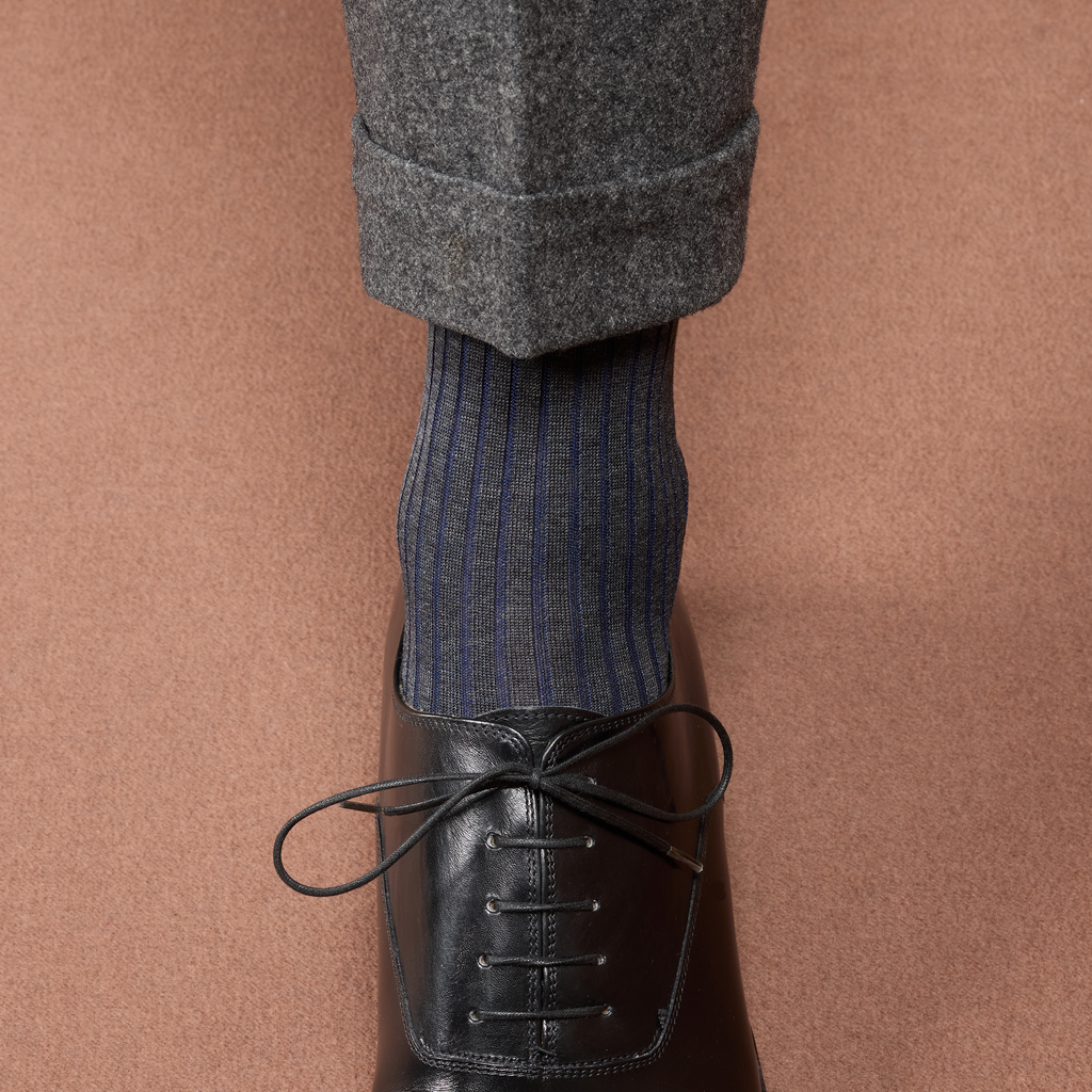 Fabricados en Italia por Mazarin, estos calcetines de media altura en hilo 100% escocés combinan el gris marengo y el azul para añadir un toque de elegancia a sus conjuntos. Las rayas verticales son reversibles, por lo que podrá mezclarlas y combinarlas según su atuendo. Son de excelente calidad, con talones y punteras reforzados. Además, estos calcetines de media altura están tejidos a mano.