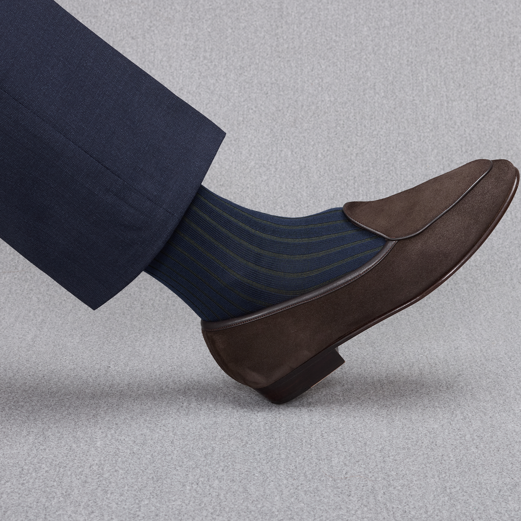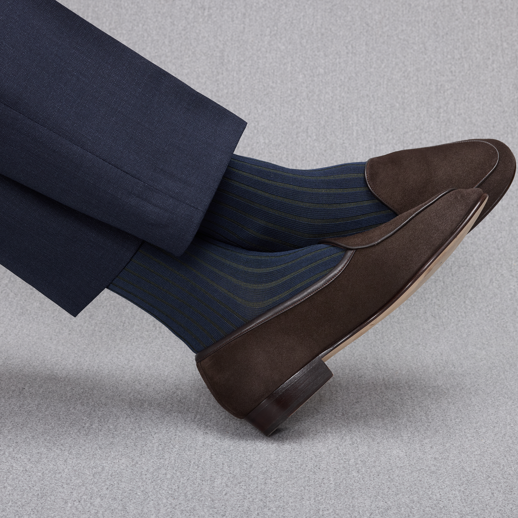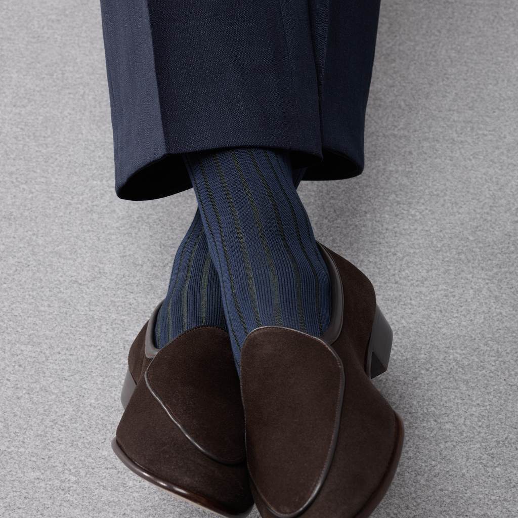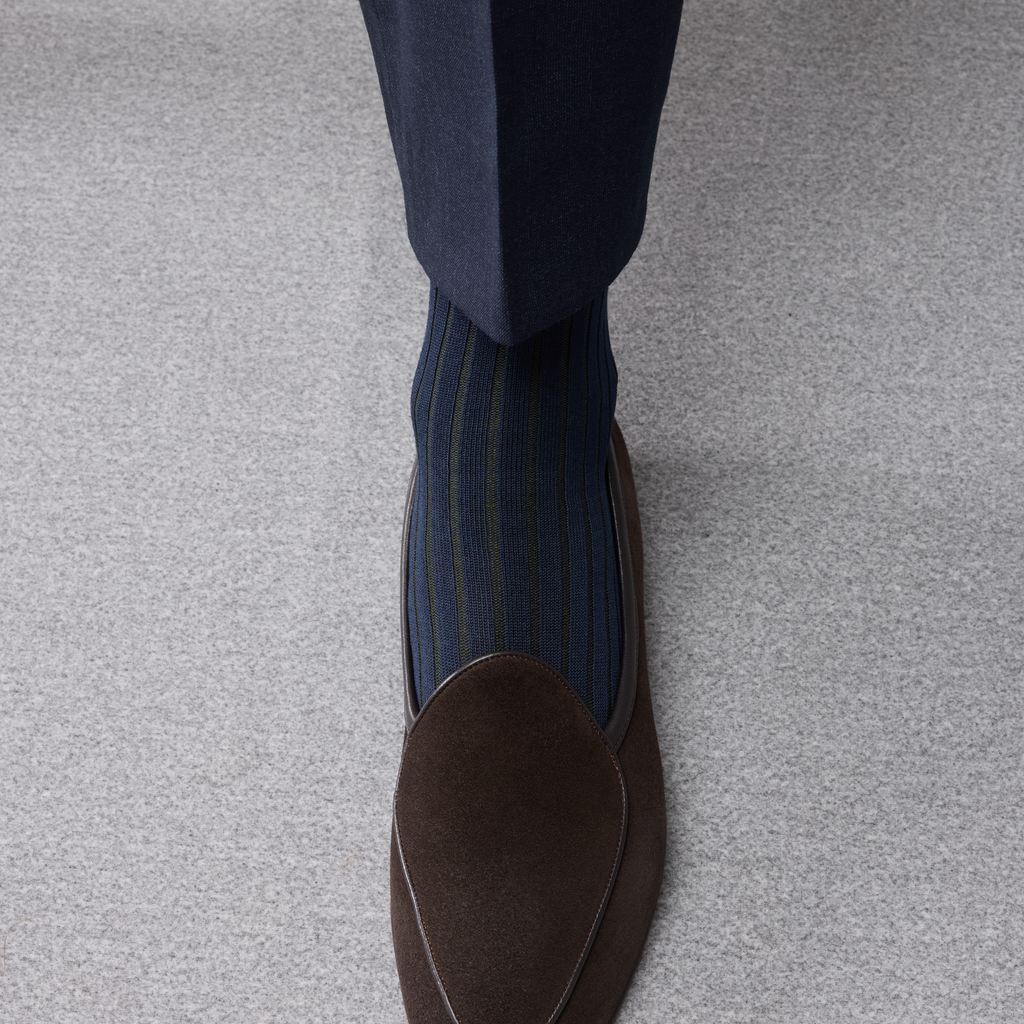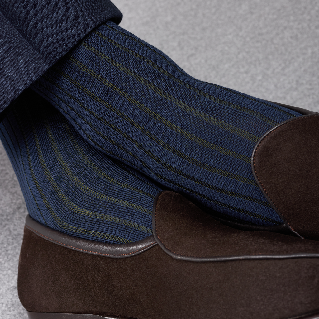 Descubra este modelo sobrio y muy elegante de calcetines azul marino con rayas verde kaki. La combinación de estos dos colores es refinada sin resultar demasiado llamativa. Puede combinarlos con conjuntos formales en tonos oscuros como azul marino o negro, o con looks más informales como unos vaqueros.