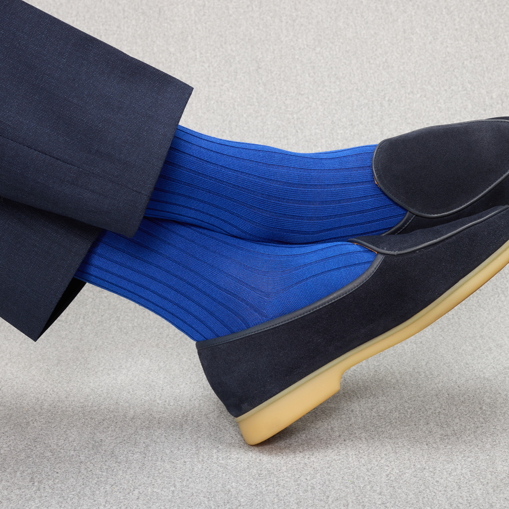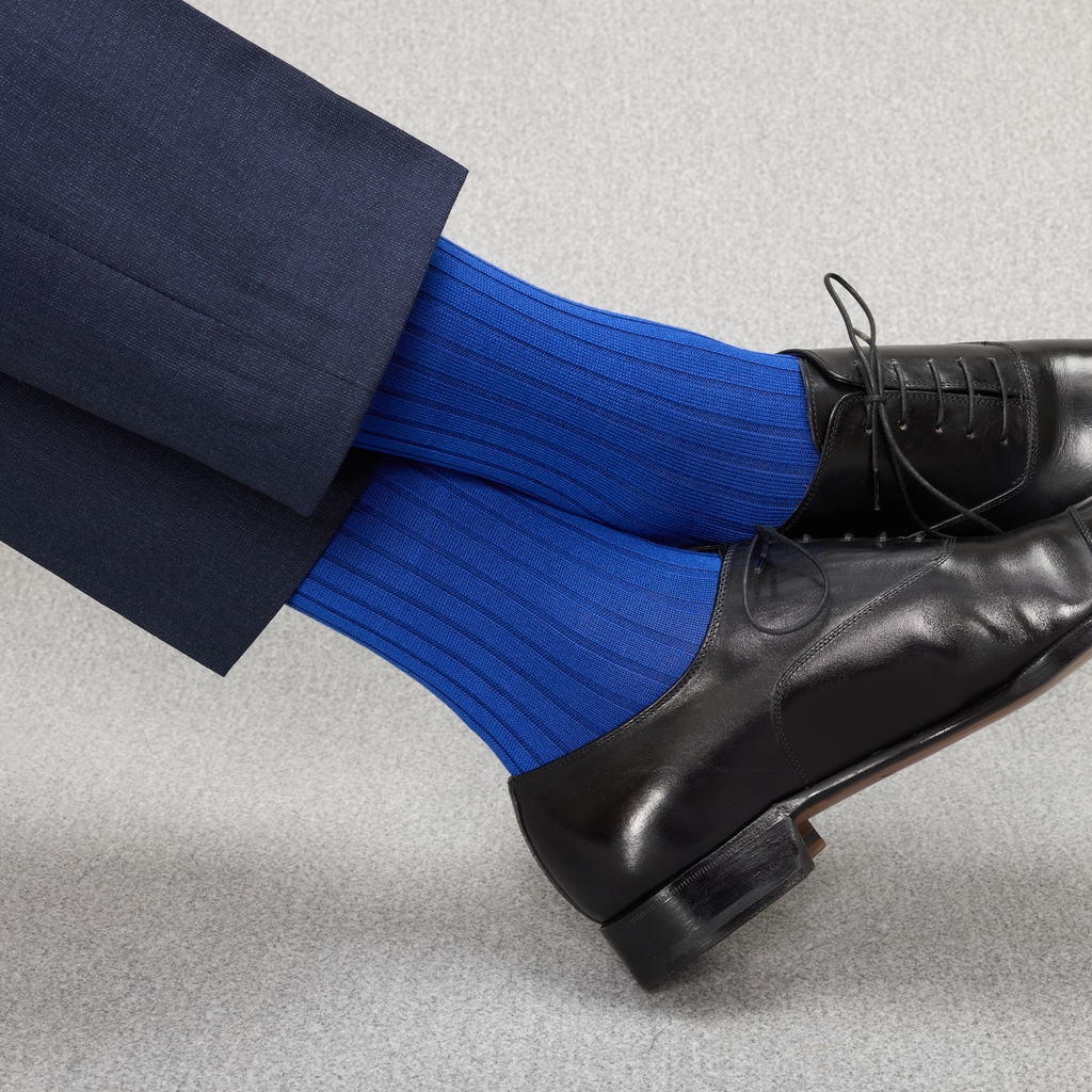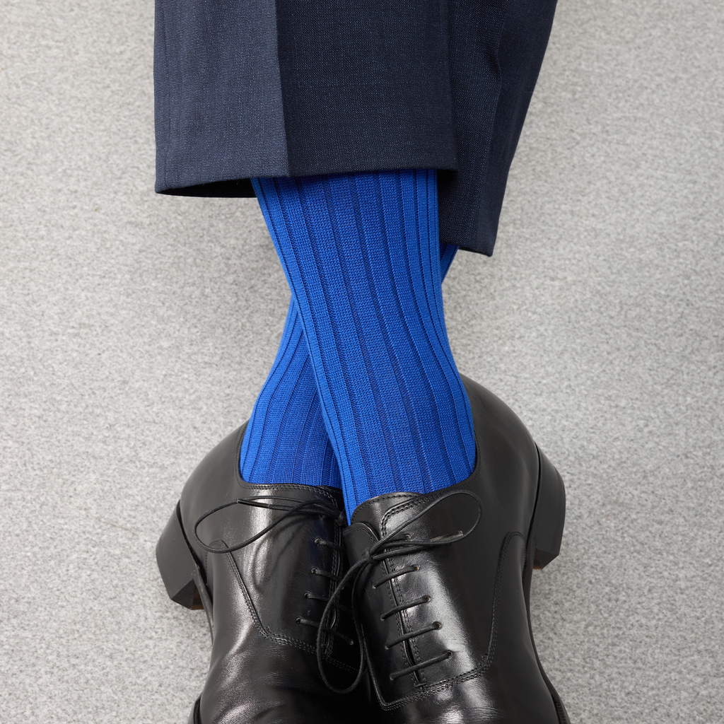Dele vida a su ropa calzándose estos fantásticos calcetines altos en azul eléctrico. Llegan justo por debajo de las rodillas: unos calcetines que marcan efecto. Combinan muy bien con numerosas prendas de ropa, tanto con trajes elegantes, como con vaqueros. Llevan poliamida, el mismo material sintético que se utiliza para los amarres de los barcos por su gran fuerza y durabilidad.