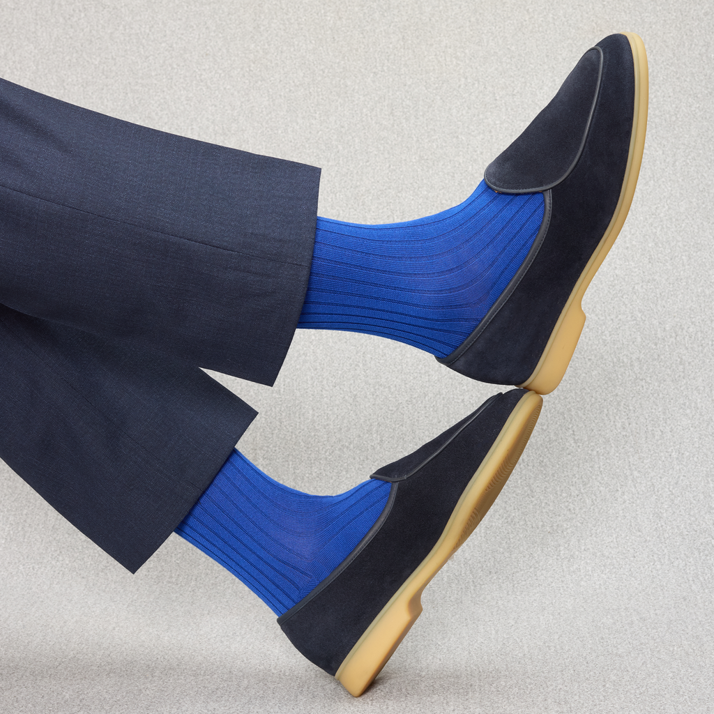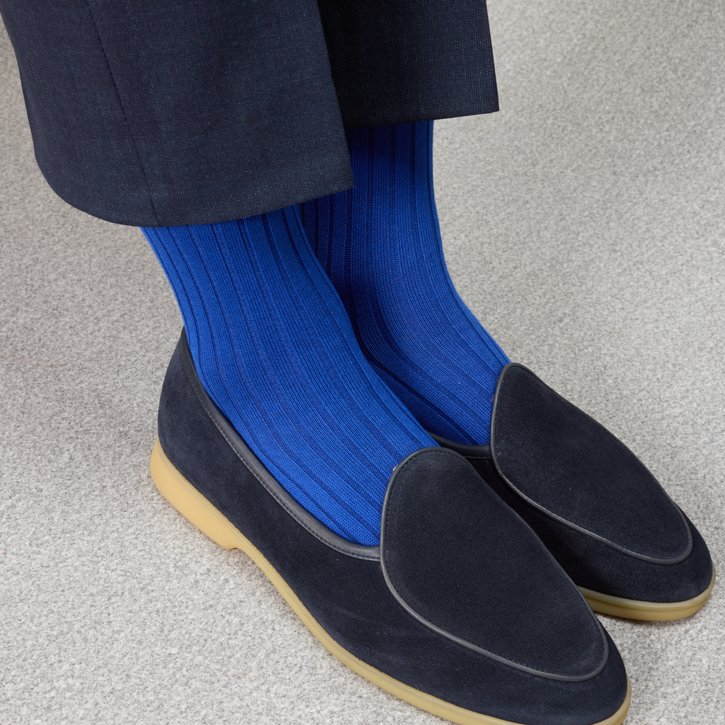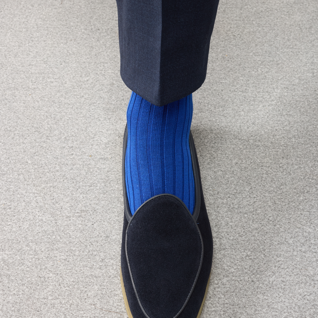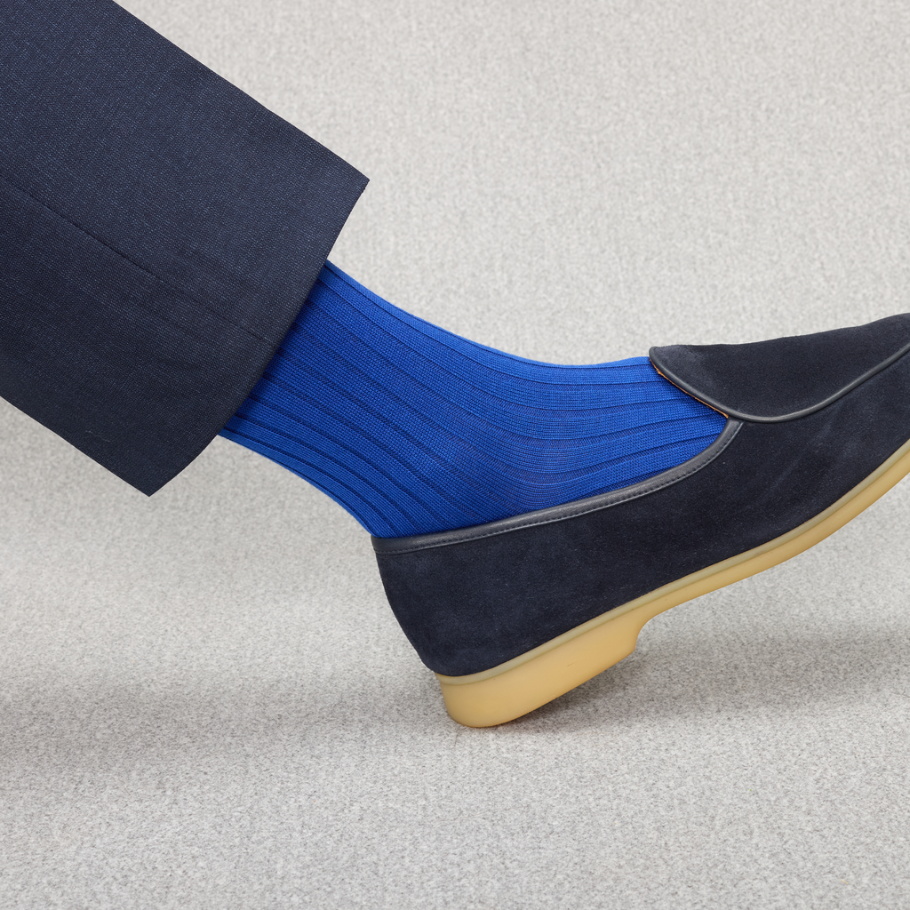 Dele vida a su ropa calzándose estos fantásticos calcetines altos en azul eléctrico. Llegan justo por debajo de las rodillas: unos calcetines que marcan efecto. Combinan muy bien con numerosas prendas de ropa, tanto con trajes elegantes, como con vaqueros. Llevan poliamida, el mismo material sintético que se utiliza para los amarres de los barcos por su gran fuerza y durabilidad.