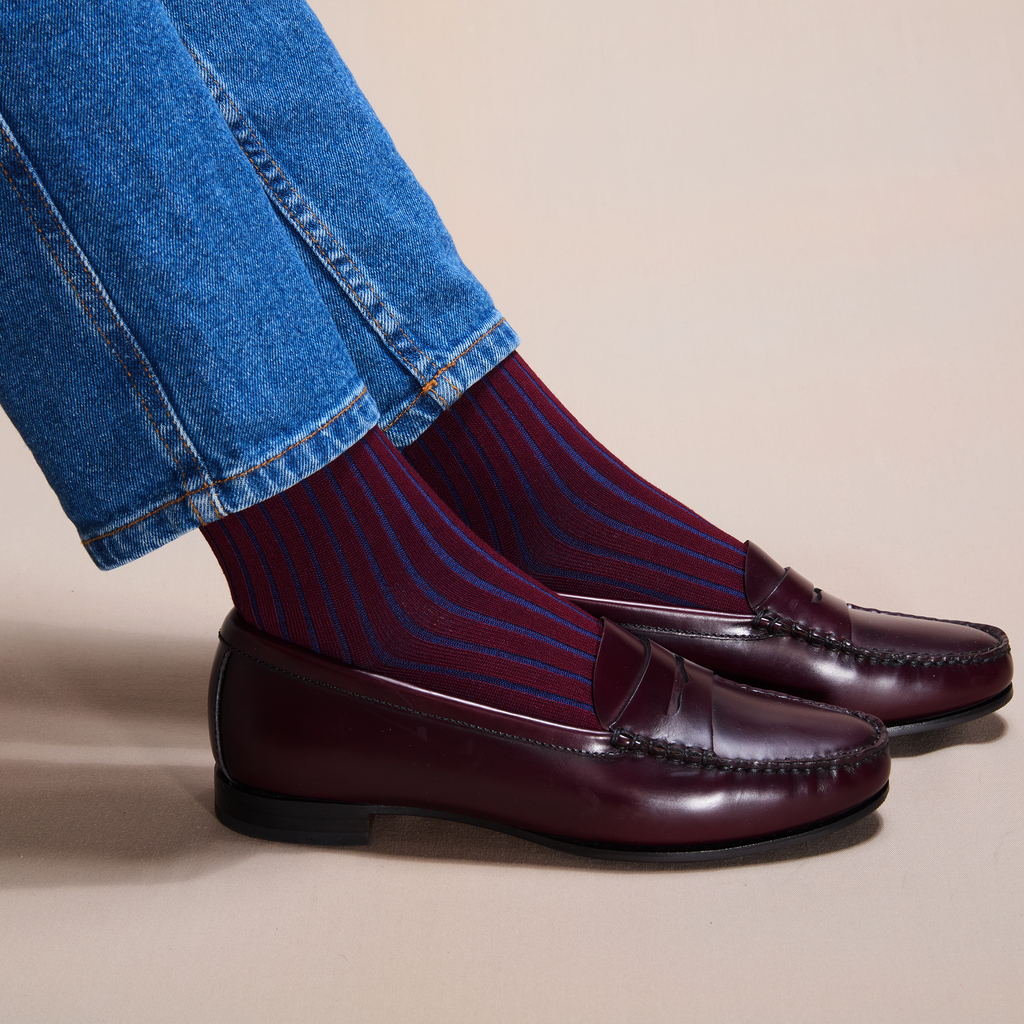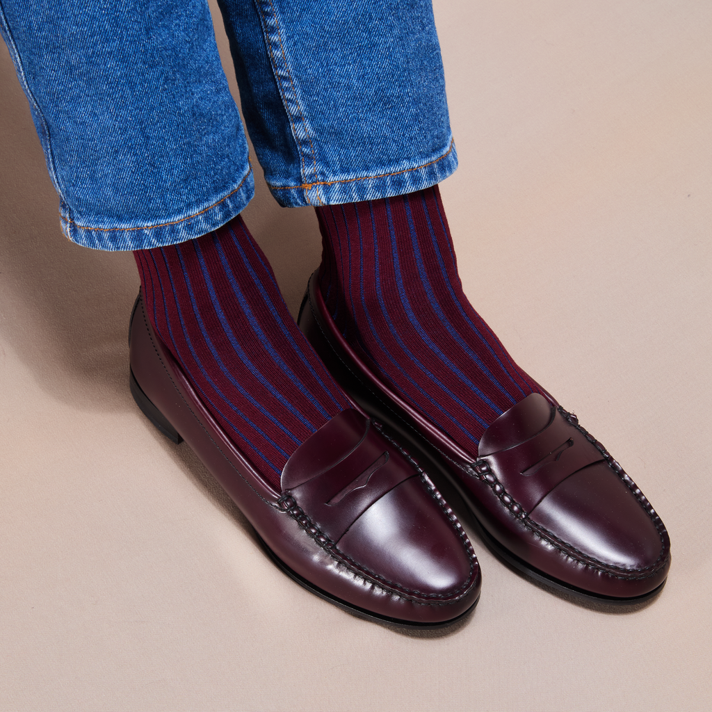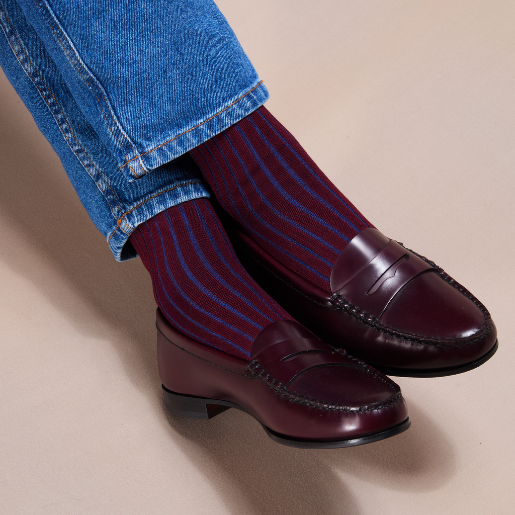 Aquí están los calcetines burdeos y azules de la gama Super-solide de Mazarin en hilo escocés.