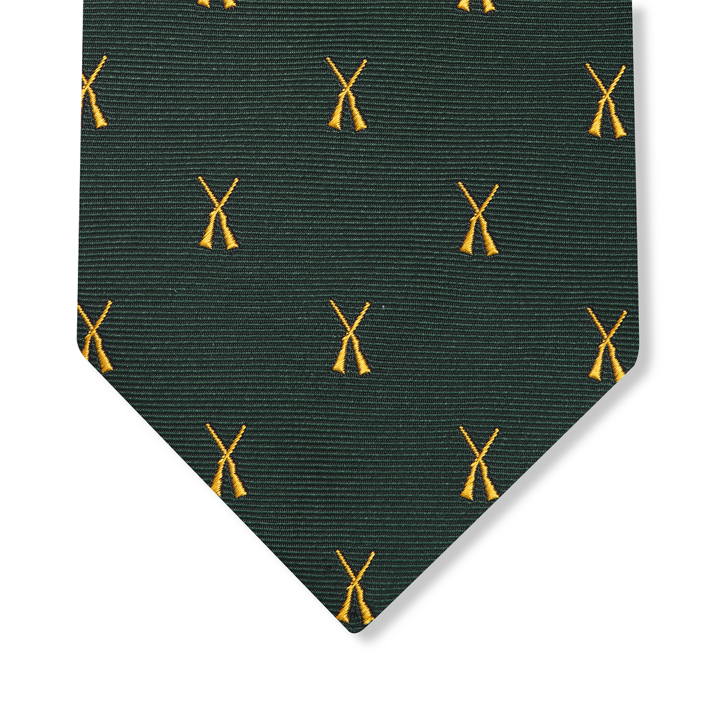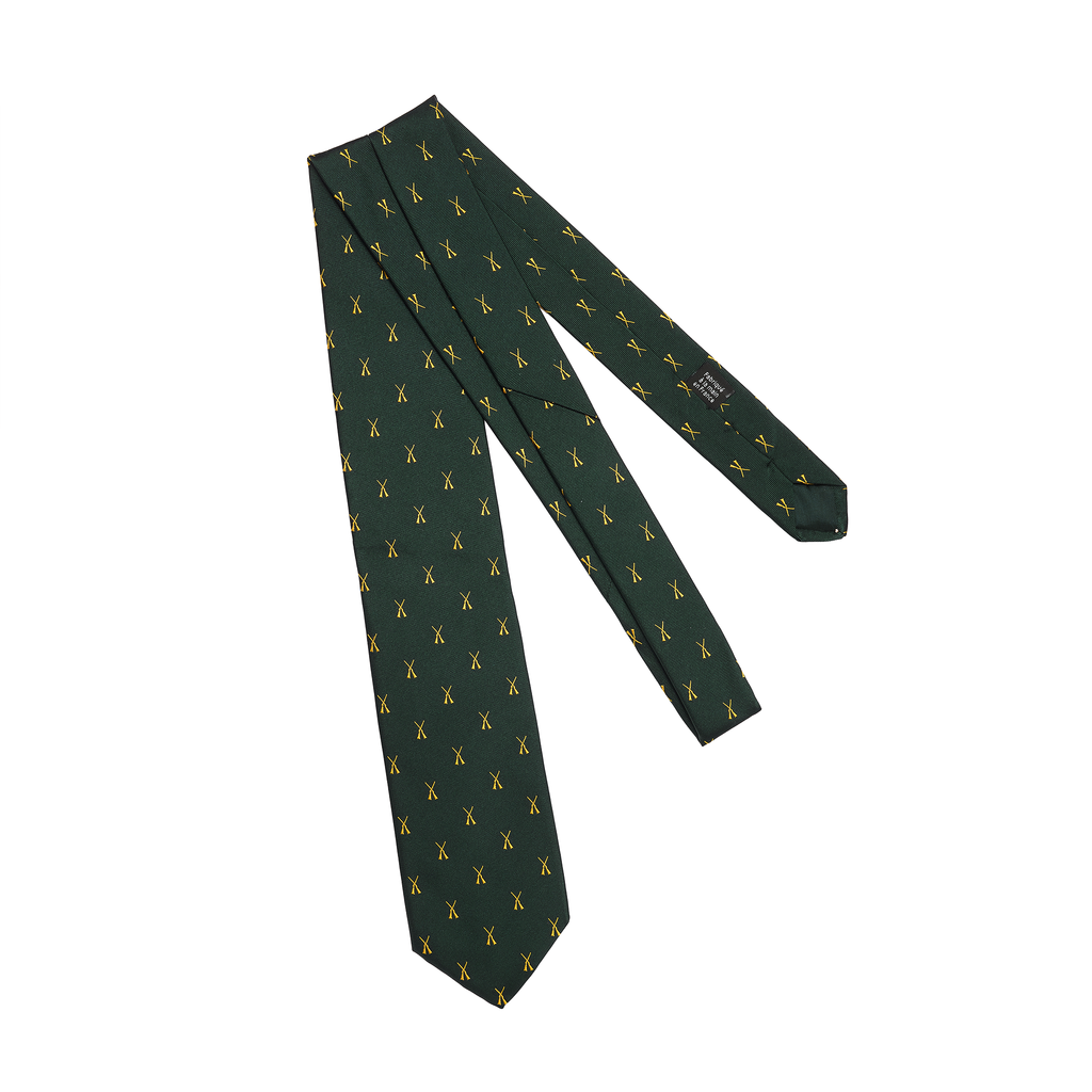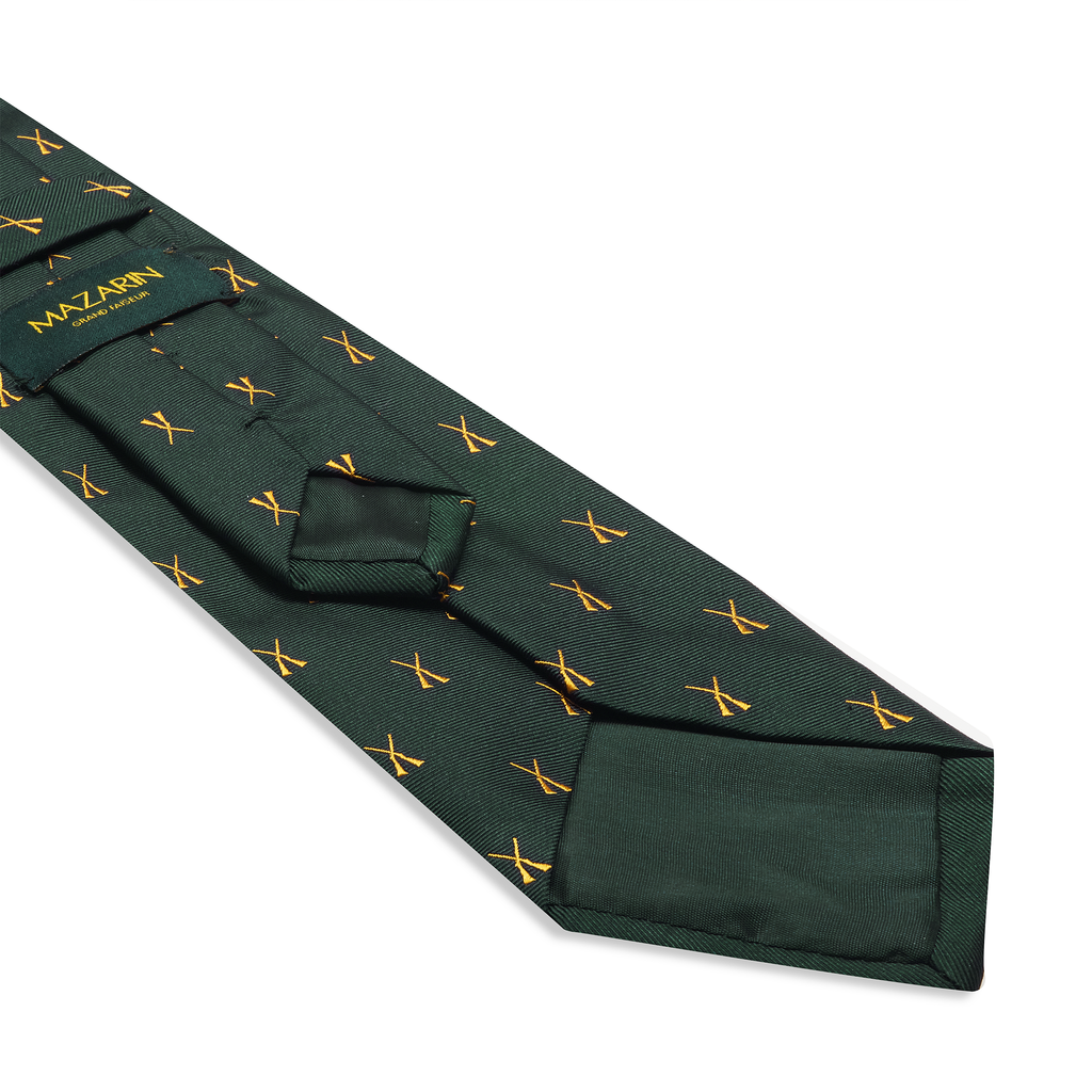Corbata de pura seda color verde academia con motivo de caza en color oro.
