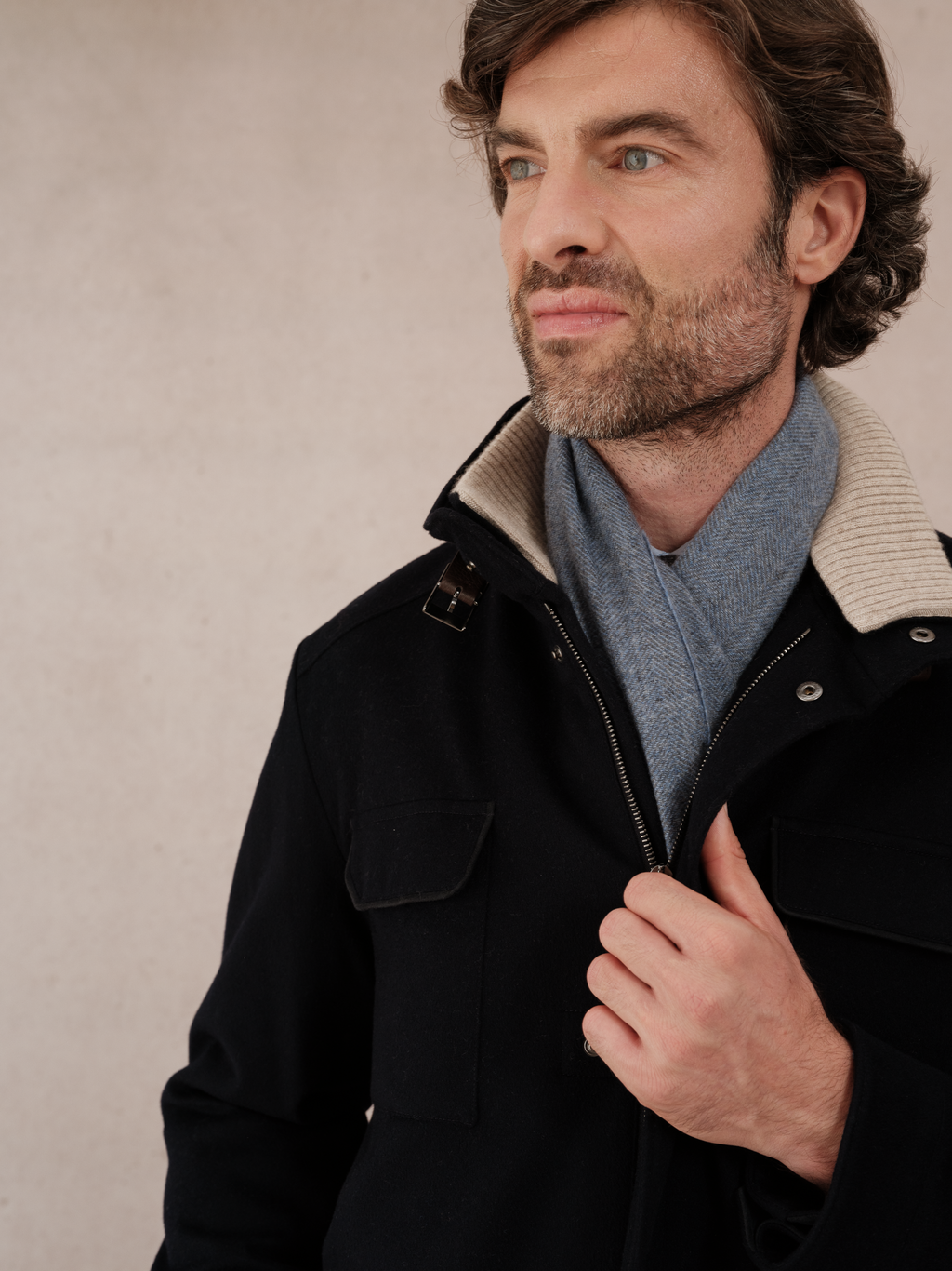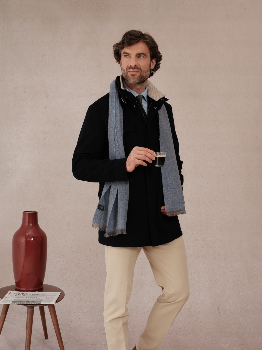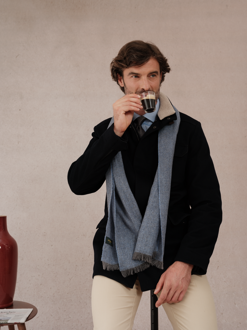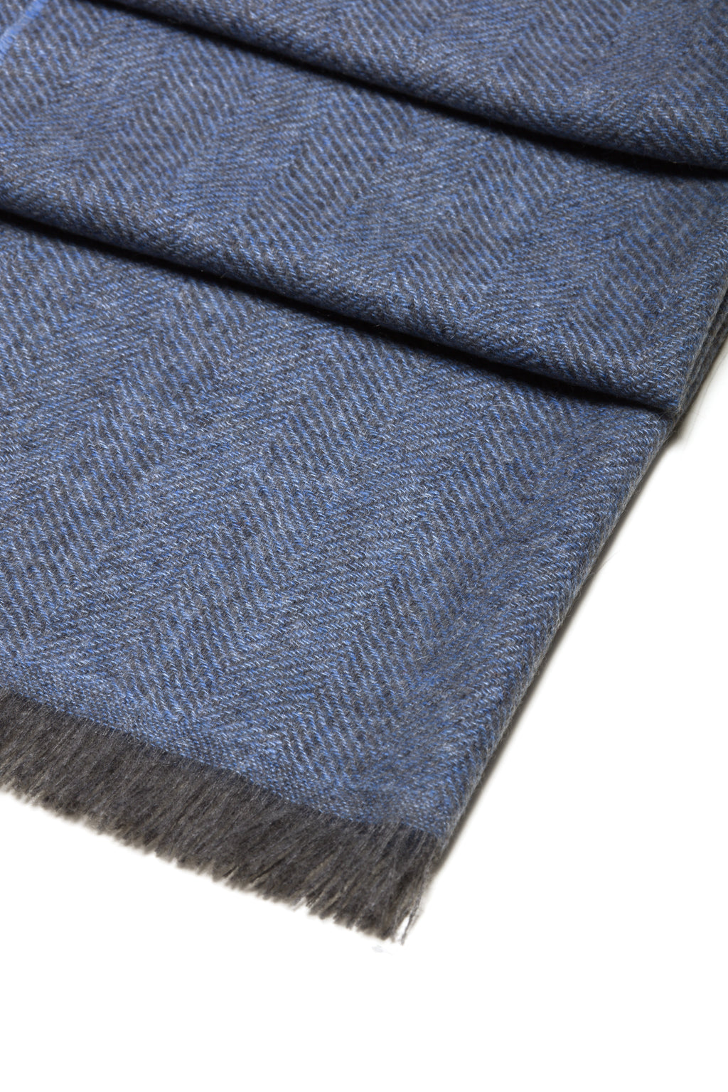 Descubra este elegante pañuelo fino de cachemira pura, confeccionado en un tejido con motivos de espiga azul claro y gris claro.