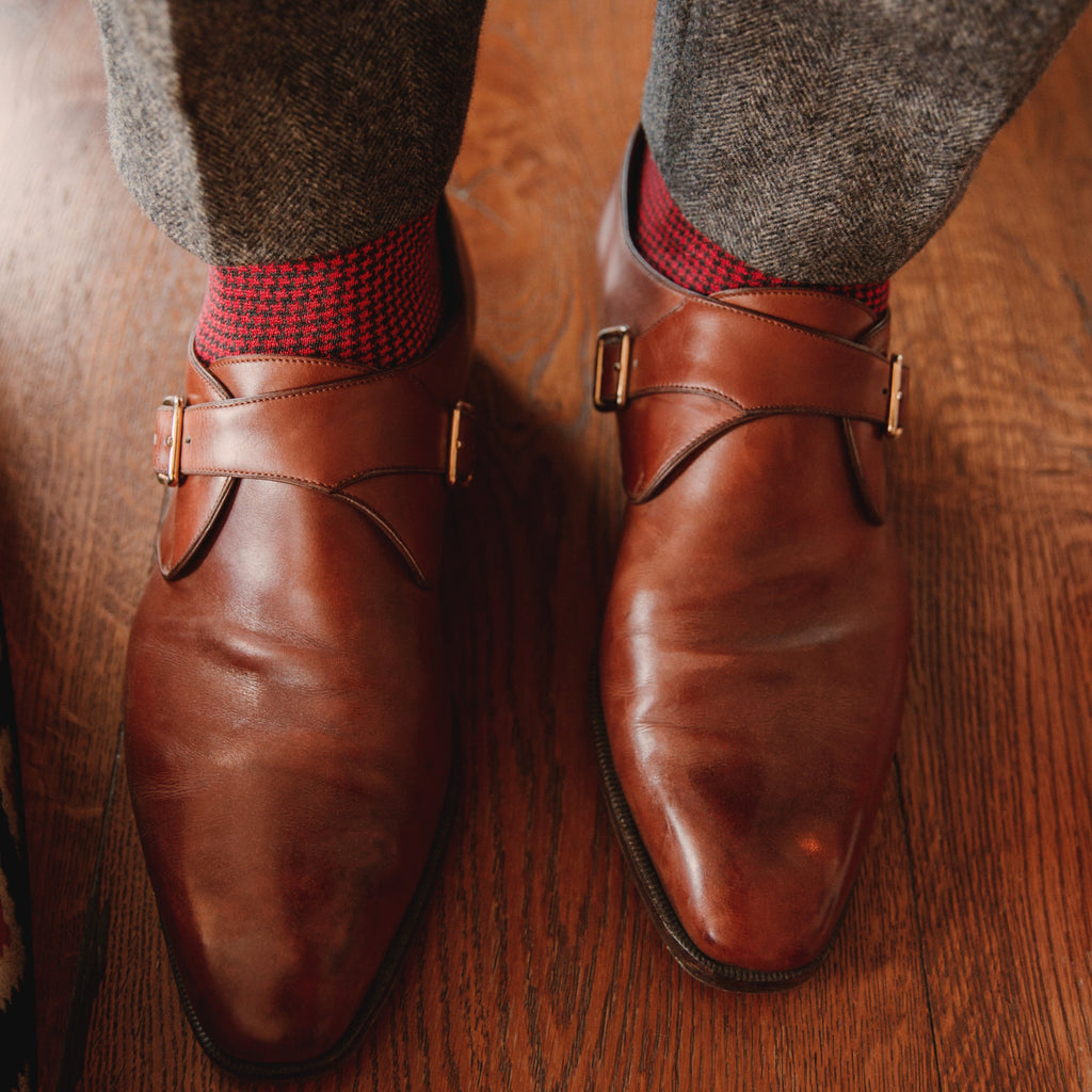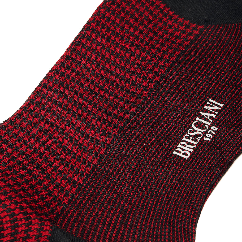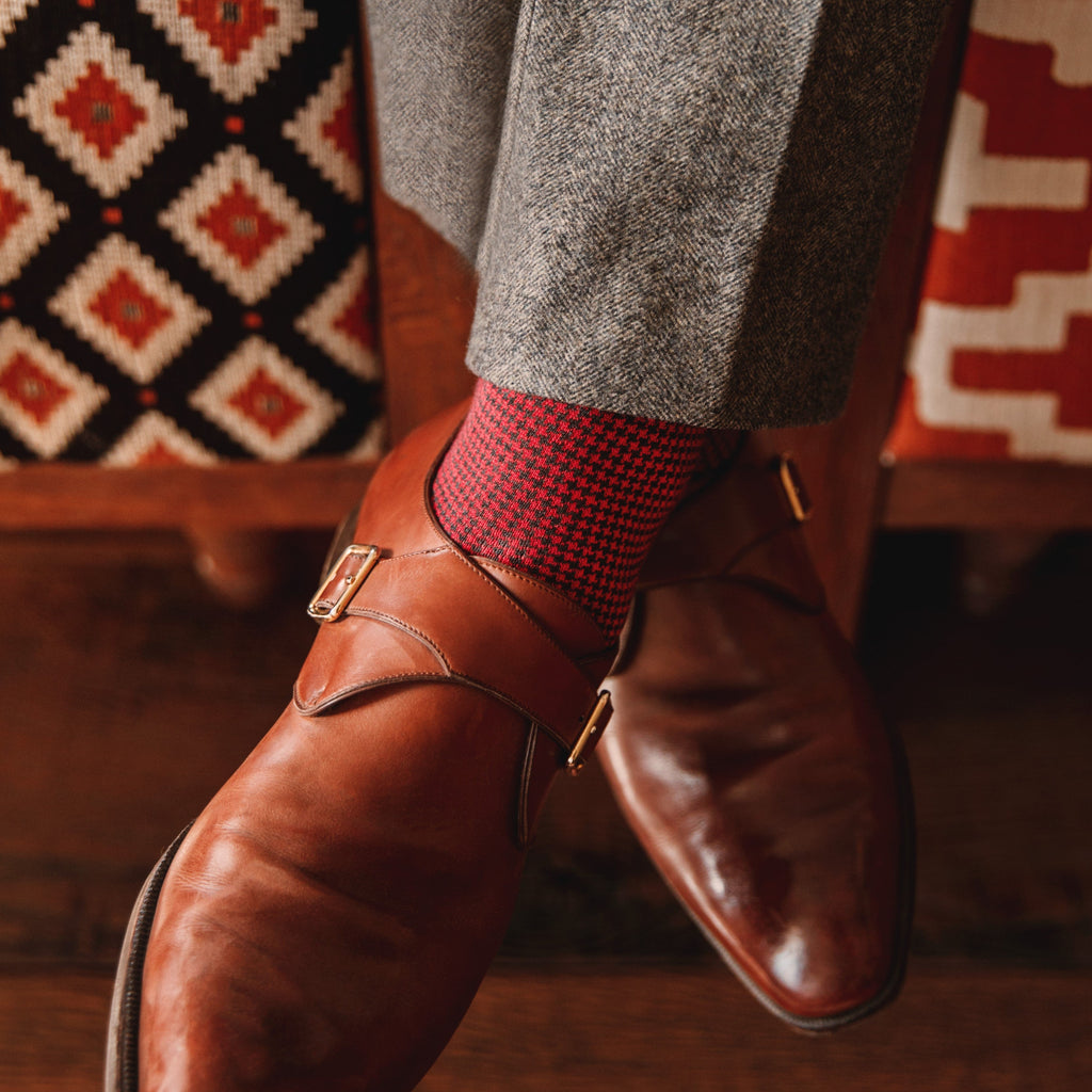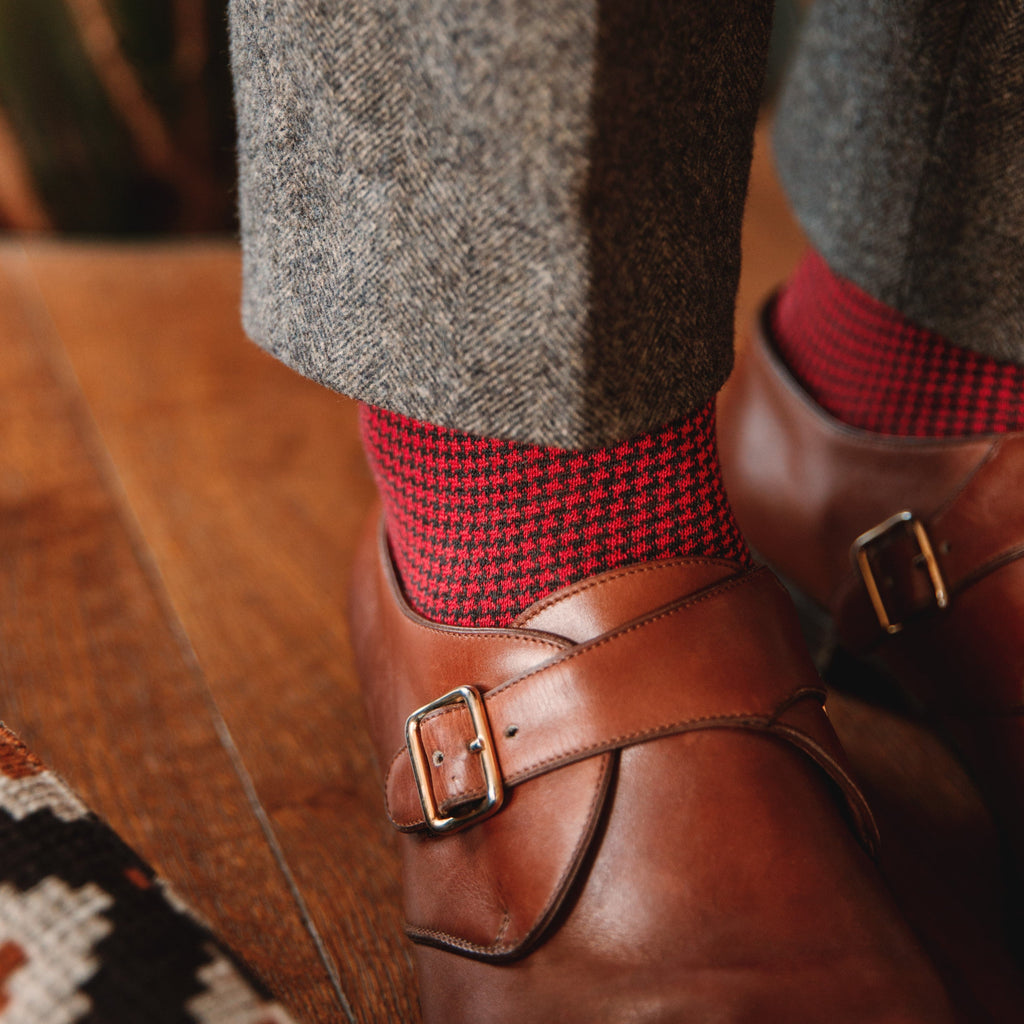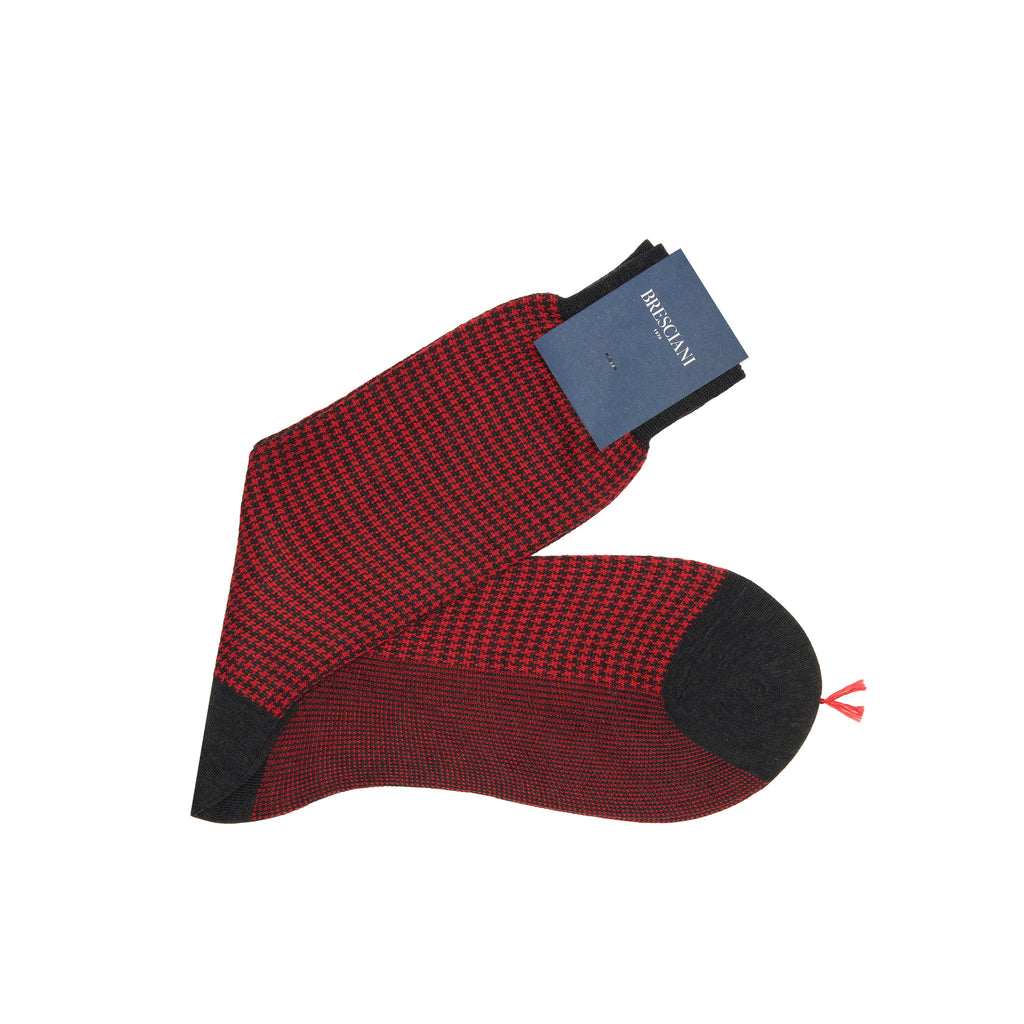 Descubra estos magníficos calcetines que sabrán alegrar sus próximos conjuntos. Están fabricados en Italia y enteramente tejidos con hilo de Escocia Hemos escogido el estampado pie de gallina asociado a un rojo vivo y atrevido.