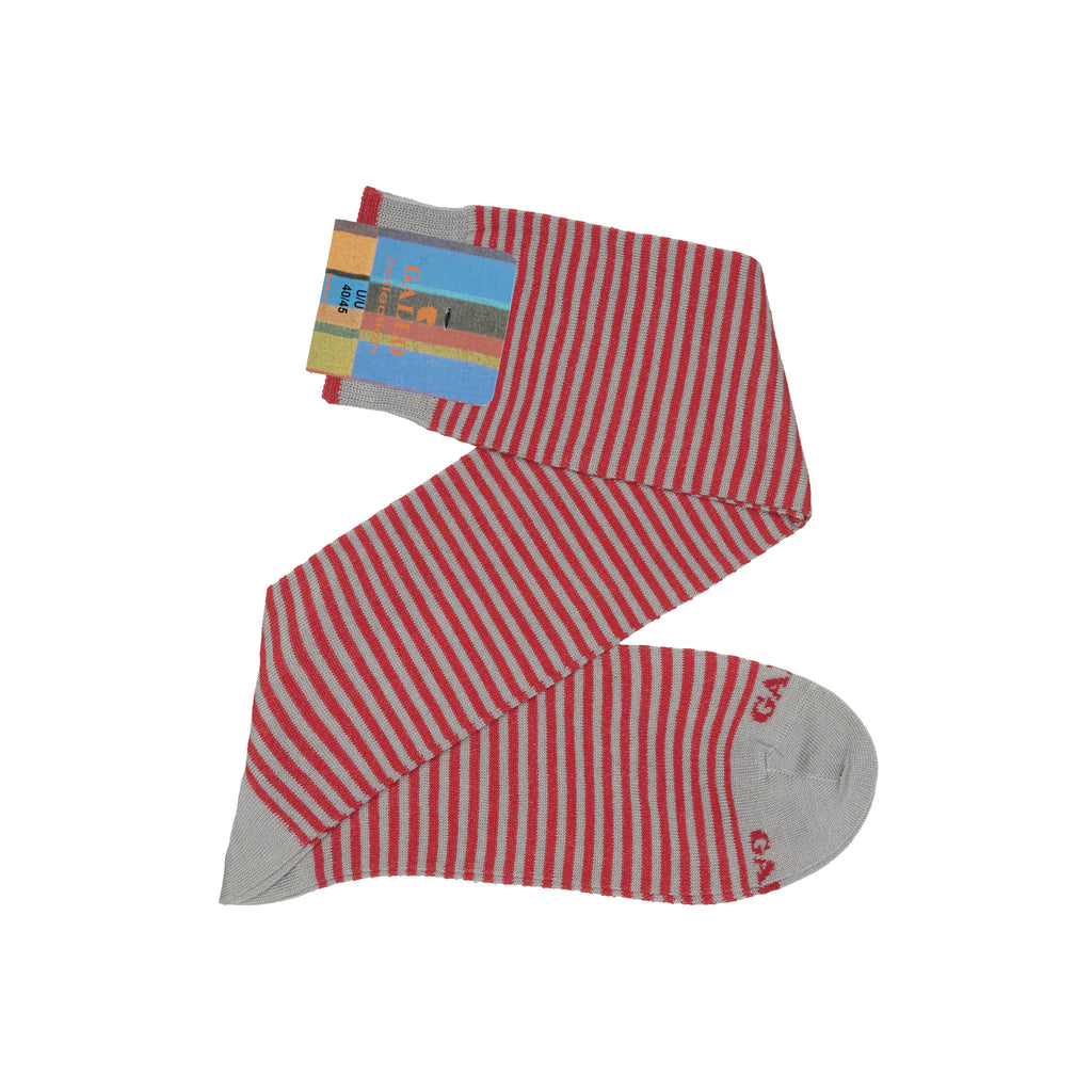 ¡Atrévase a llevar rayas verticales con estos calcetines altos rojo claros y gris polvo de algodón! Venidos de los talleres italianos Gallo, estos calcetines sublimarán sus trajes. Prolongando unos vaqueros, unos chinos, este par es muy luminoso.
