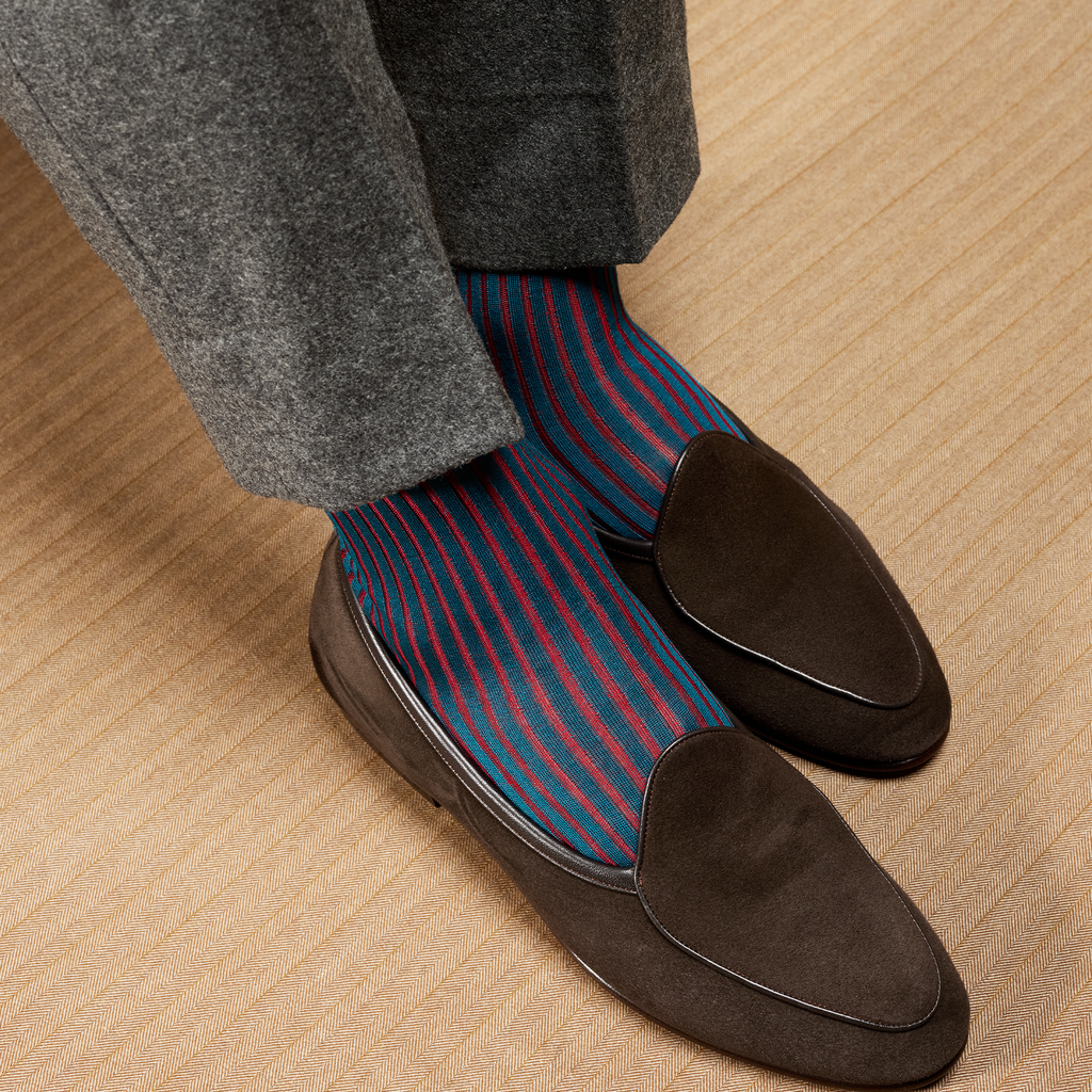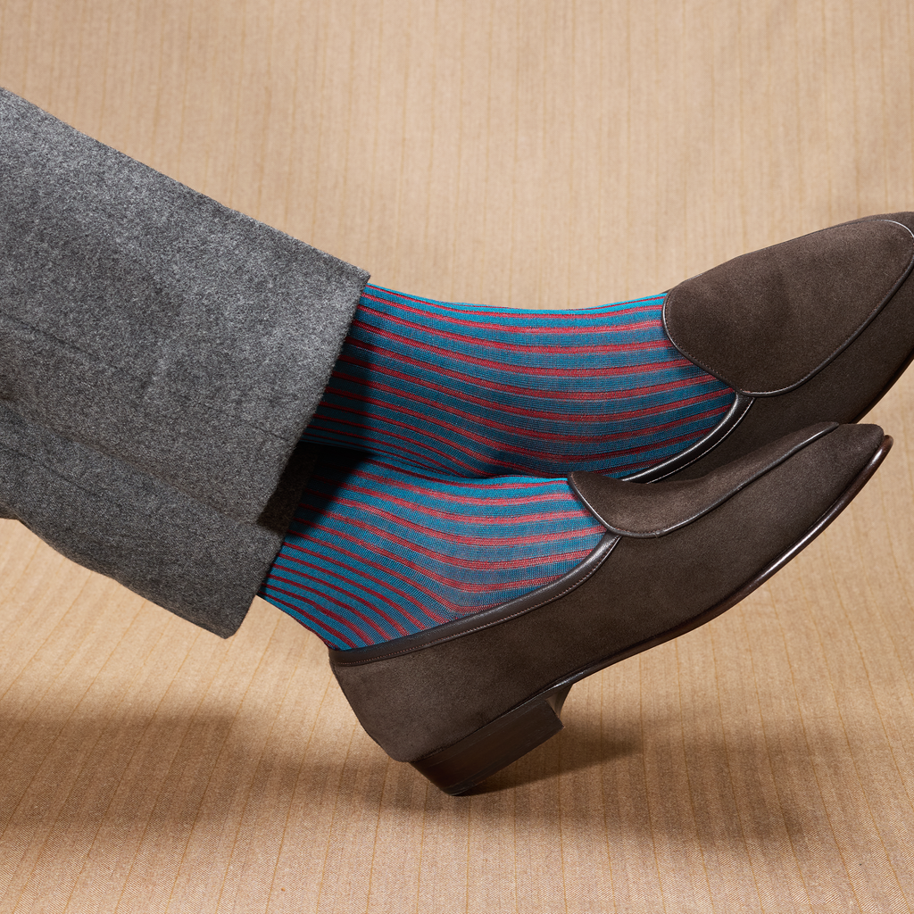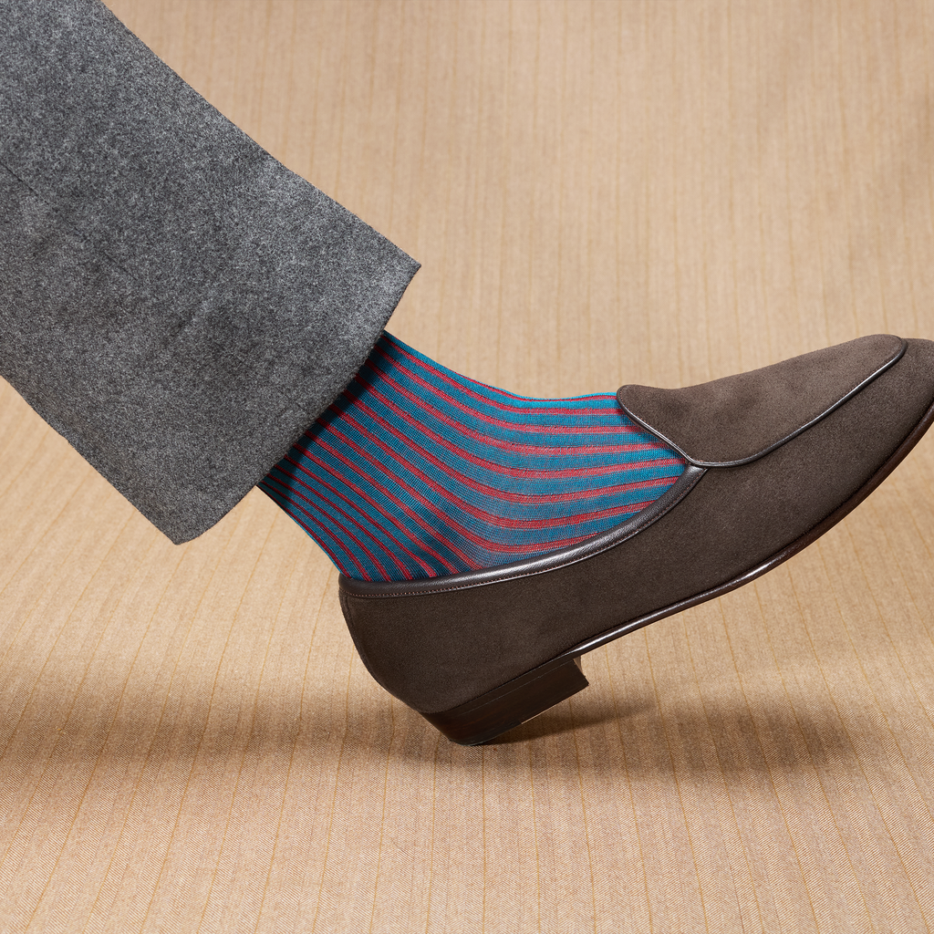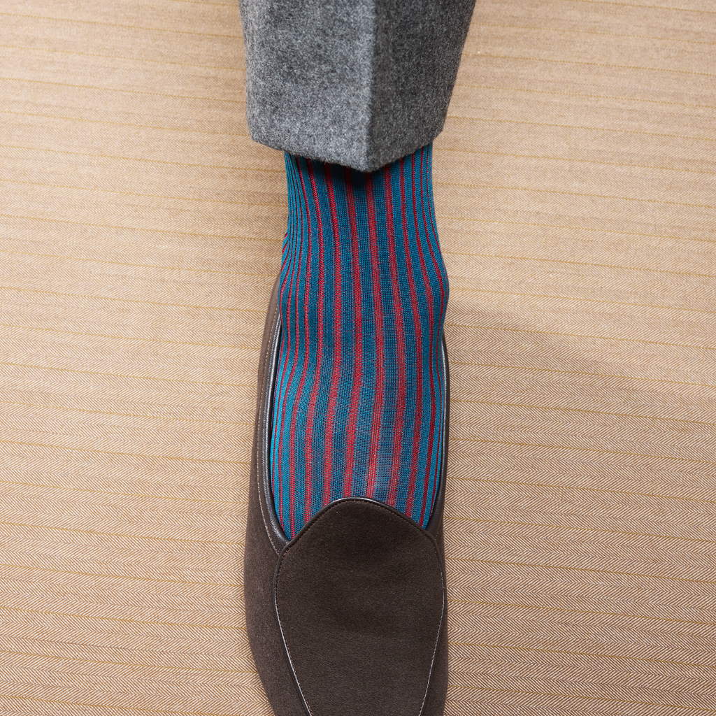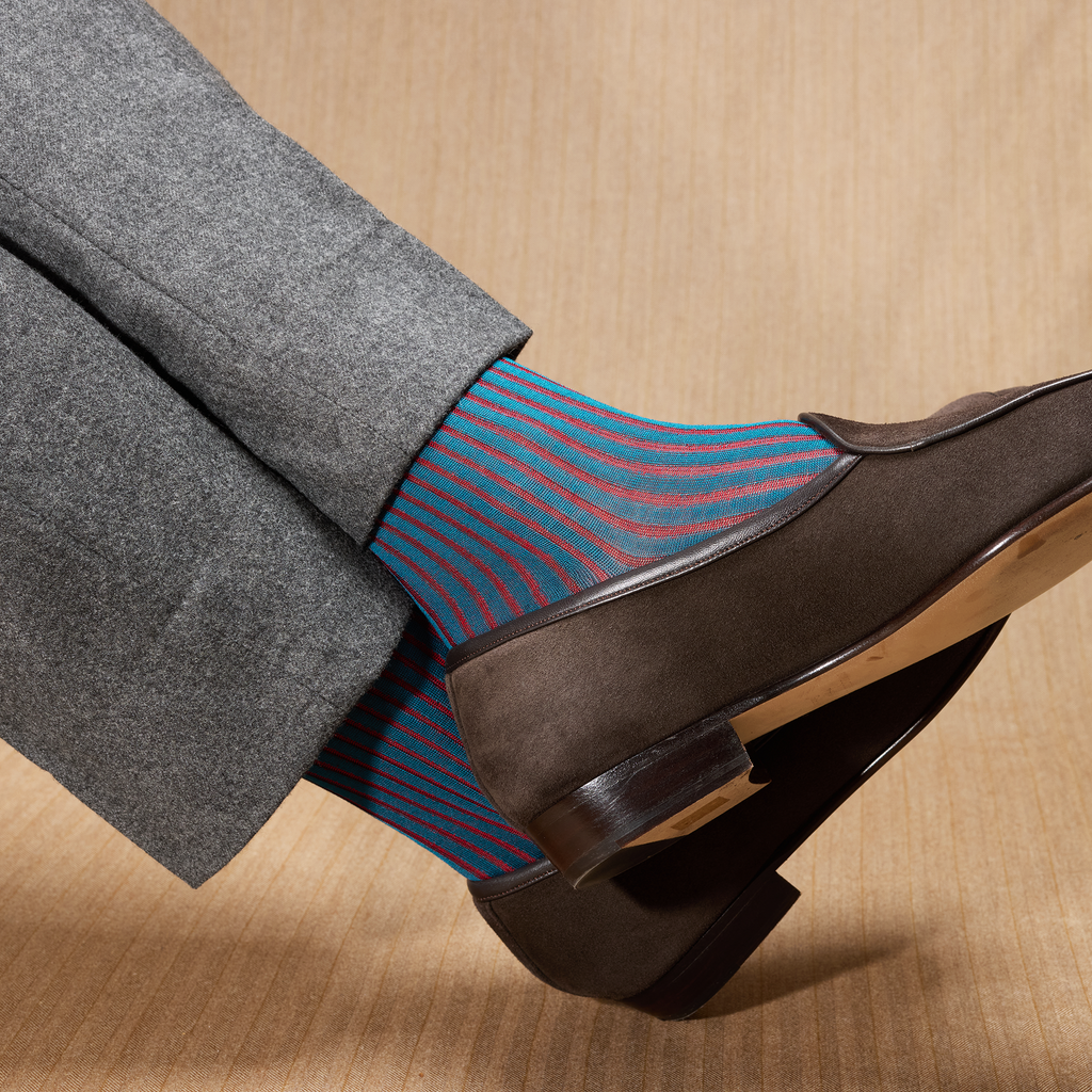 Los amantes de los calcetines originales apreciarán este modelo hasta la rodilla en puro hilo de Escocia turquesa decorado con rayas rojas brillantes. Su estilo relajado aporta un toque único tanto a conjuntos formales como informales.