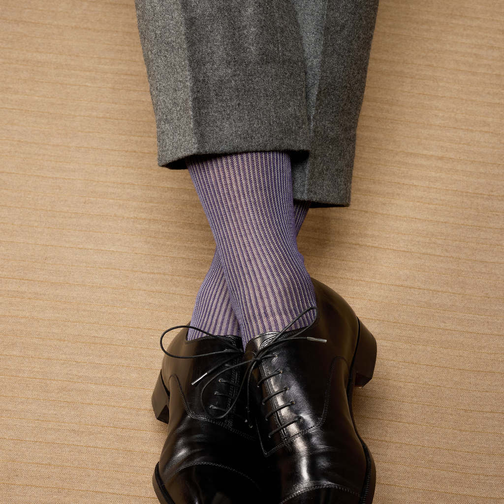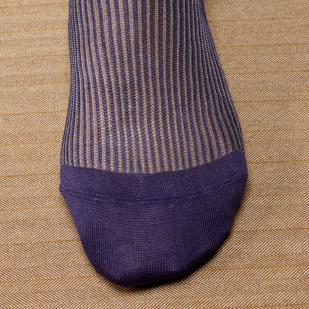 Mazarin(マザラン)のナス色とライトグレーのストライプが特徴のコットンリスル製ハイソックス。