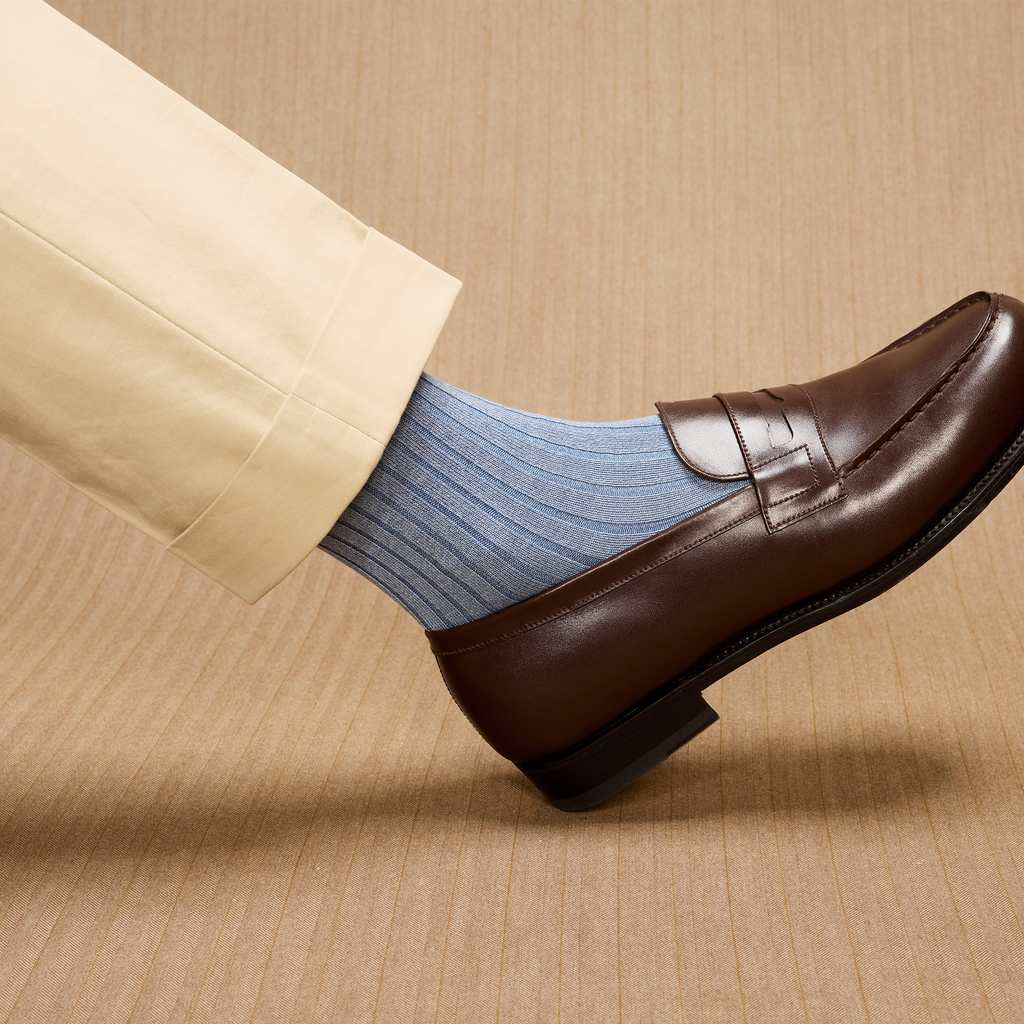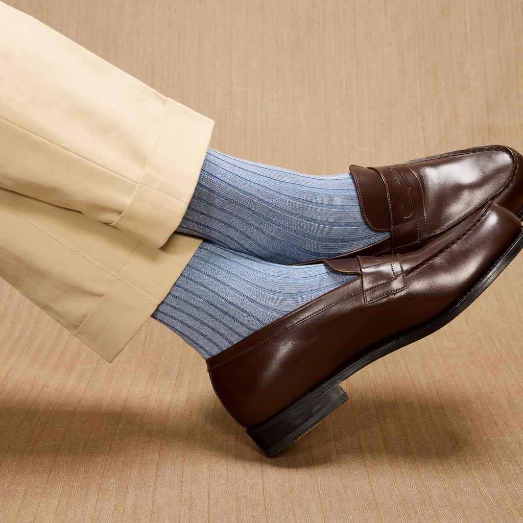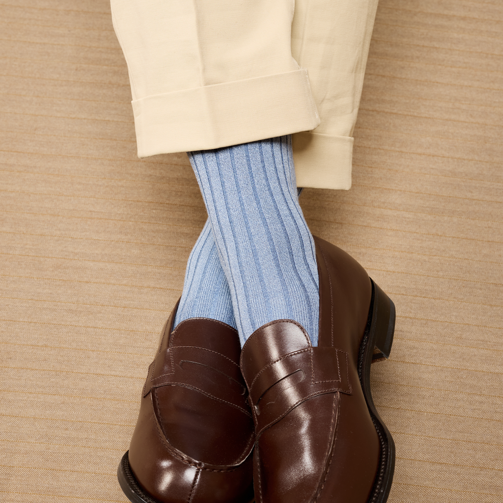 この霜降りライトブルーのミドル丈ソックスは、コーディネートに明るく上品なアクセントを加えてくれます。落ち着いたトーン(ネイビー、グリーン、グレー)との相性はもちろん、明るめの服装にもマッチし、洗練されたコントラストを演出します。