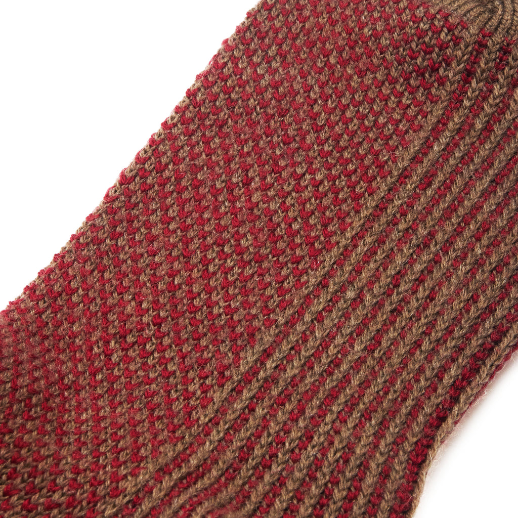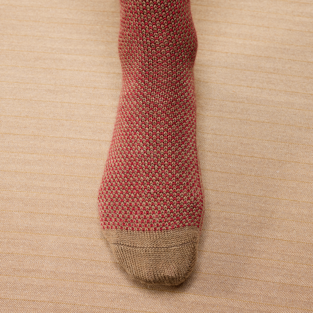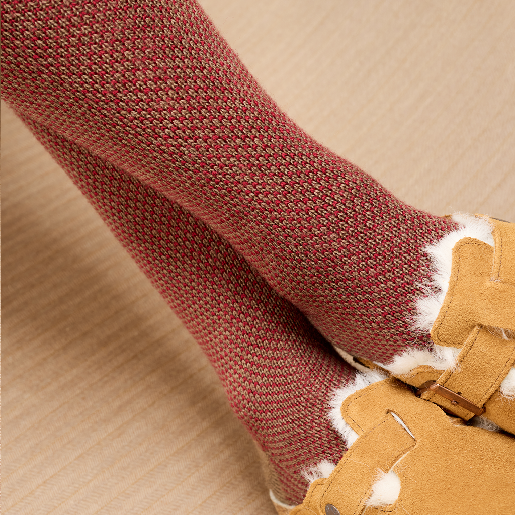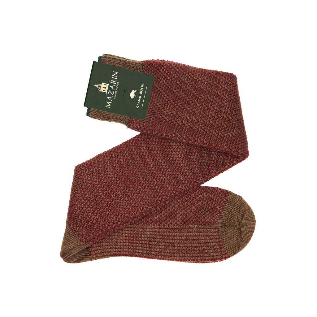 Chaussettes hautes pour femme en laine mérinos épaisse, au motif caviar taupe & rouge de la gamme Bison, par Mazarin.