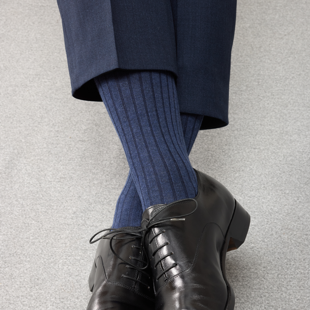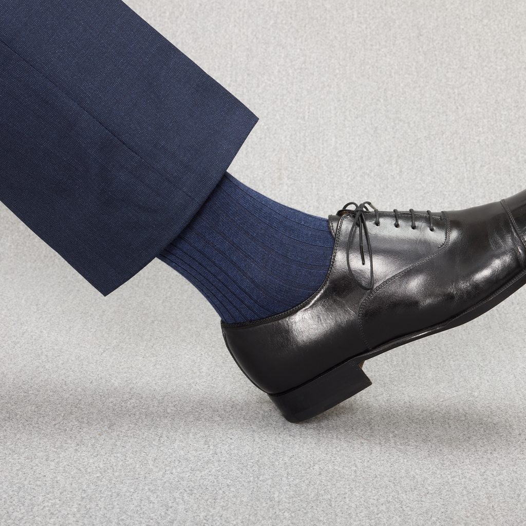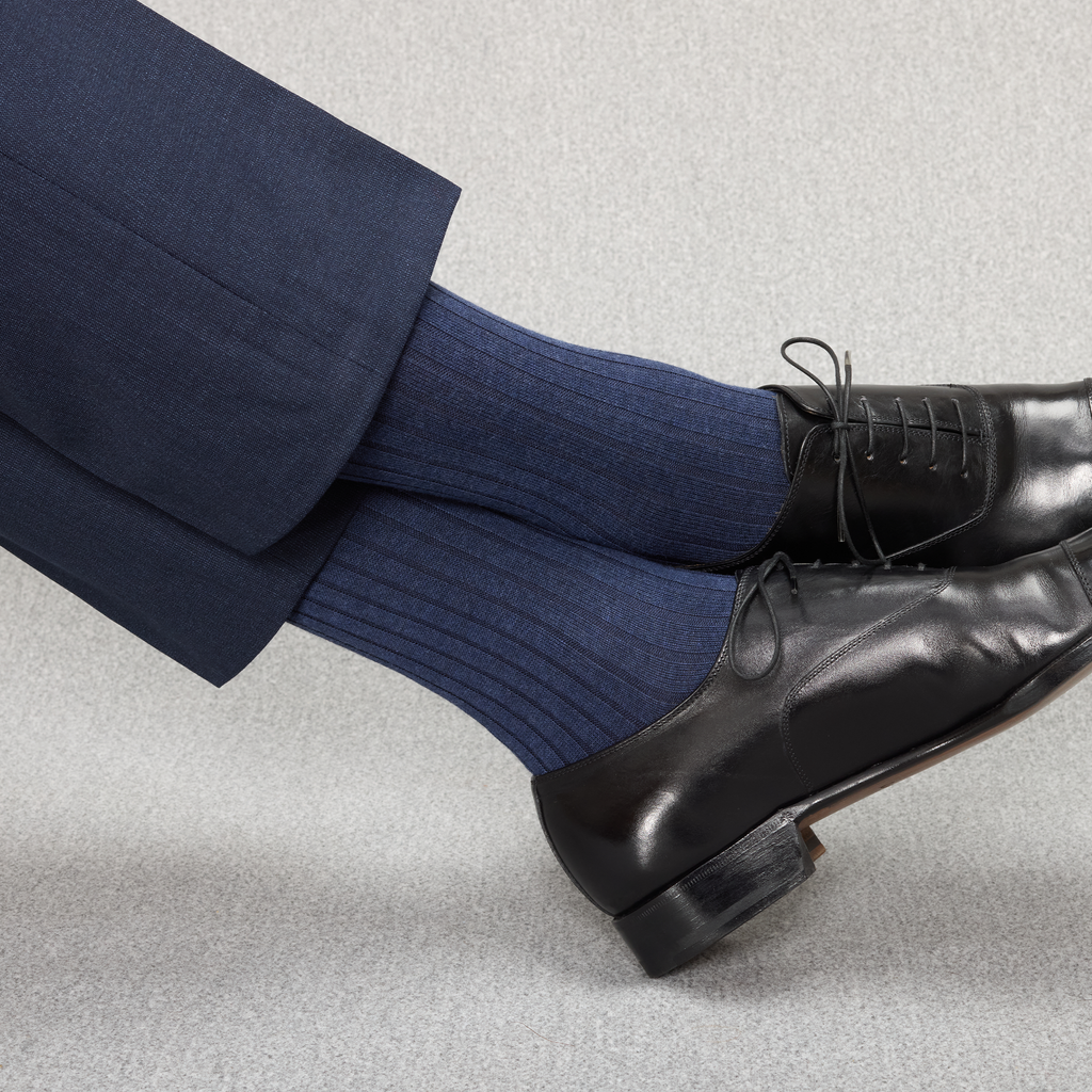 Ces chaussettes mi-bas (hautes) sont d'une sublime couleur bleu Acier en fil d'Écosse super-solide. Cette couleur est un incontournable de votre garde robe, à associer avec vos costumes bleu marine, gris ou encore marron, une superbe alternative aux traditionnelles chaussettes bleu marine ! Et pour une touche plus décontractée, glissez-les dans des sneakers blanches portées avec un jean, effet casual chic garanti.