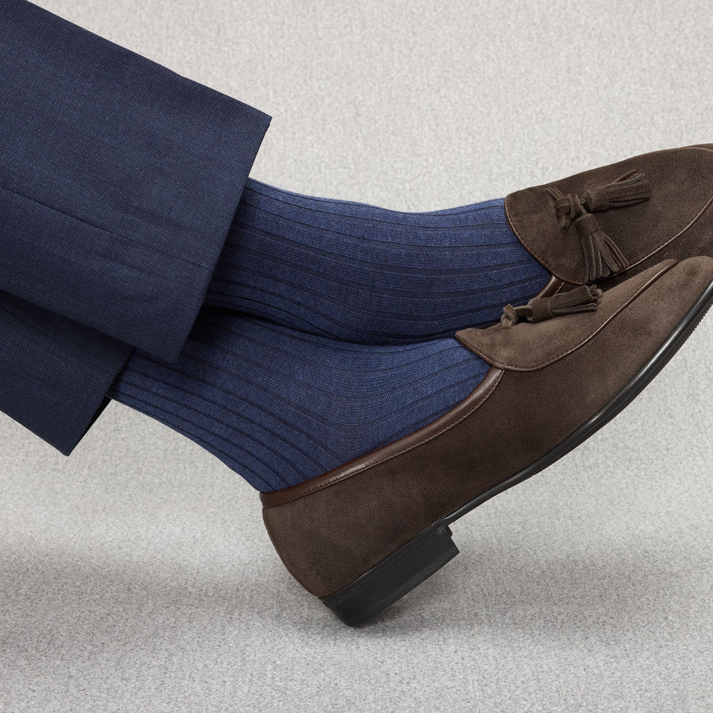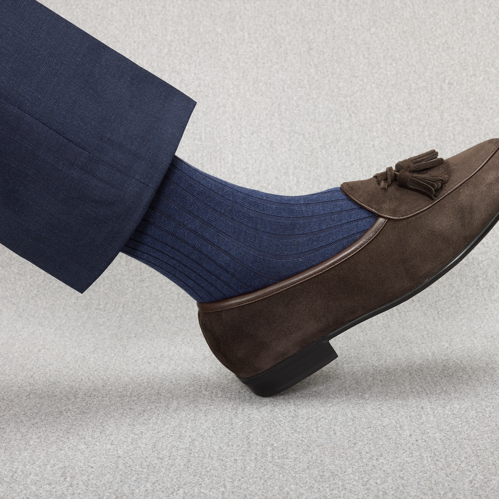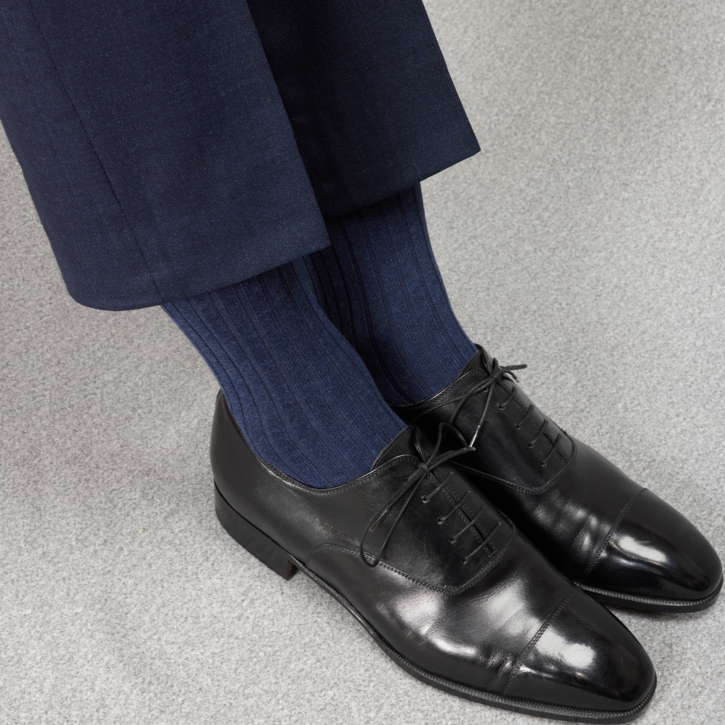Ces chaussettes mi-bas (hautes) sont d'une sublime couleur bleu Acier en fil d'Écosse super-solide. Cette couleur est un incontournable de votre garde robe, à associer avec vos costumes bleu marine, gris ou encore marron, une superbe alternative aux traditionnelles chaussettes bleu marine ! Et pour une touche plus décontractée, glissez-les dans des sneakers blanches portées avec un jean, effet casual chic garanti.