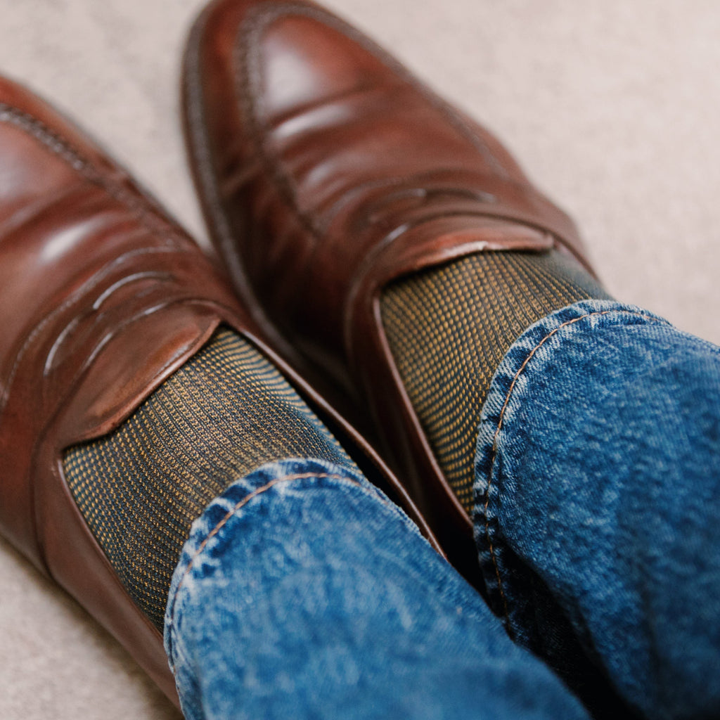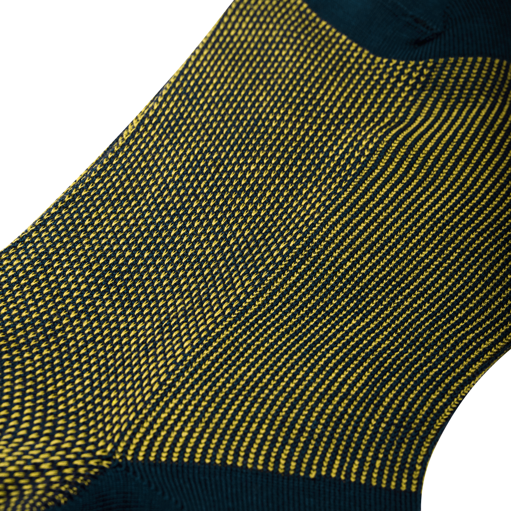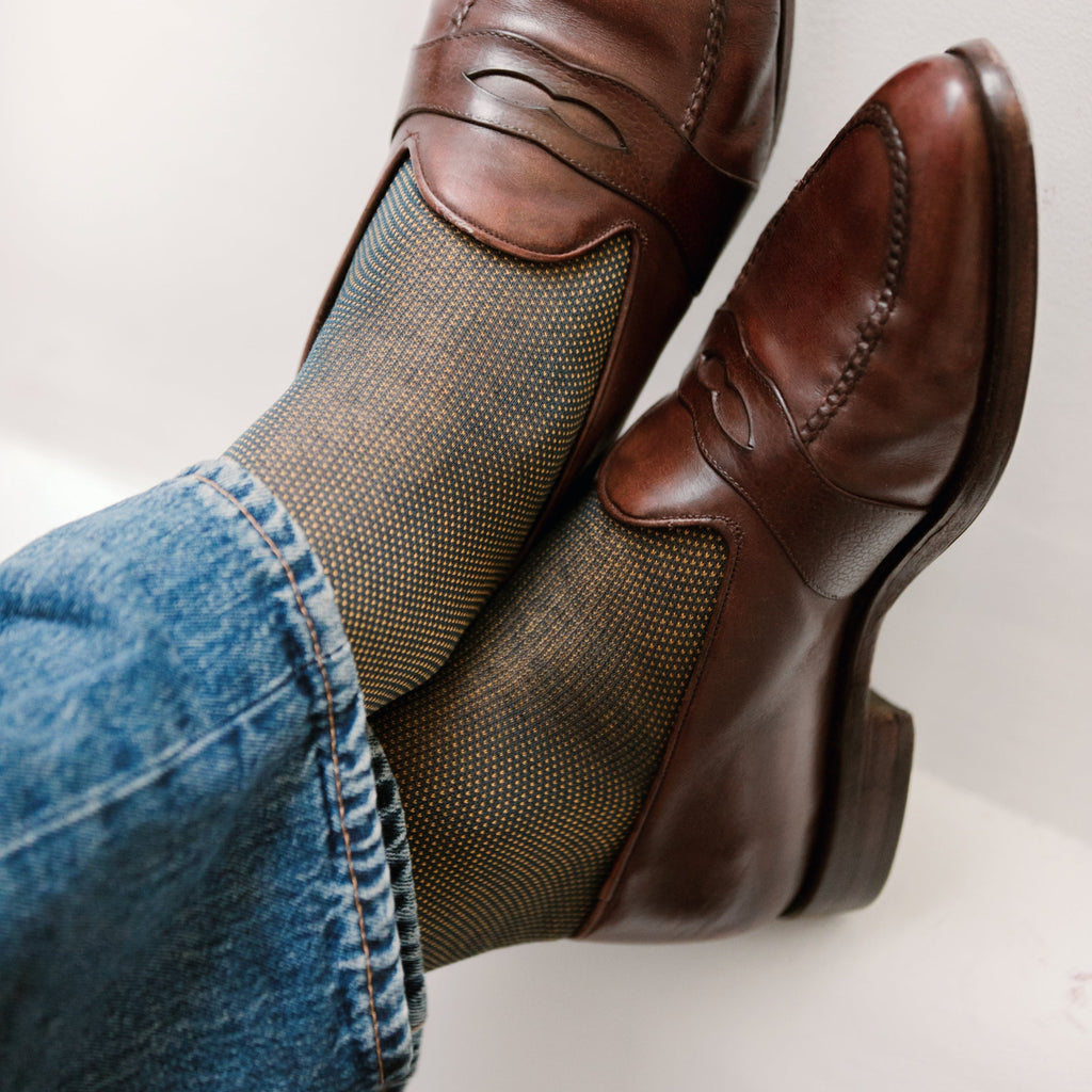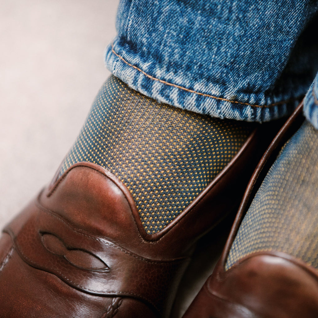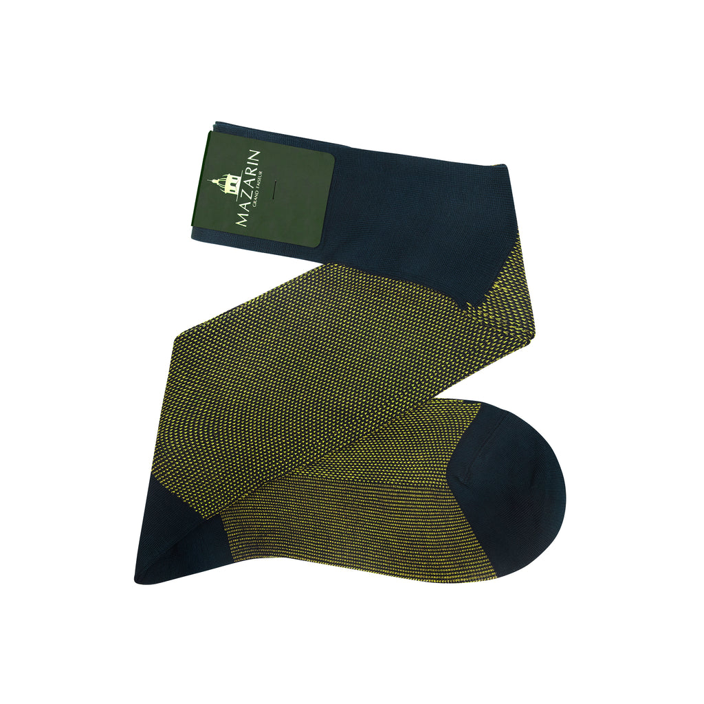 Succombez au discret motif caviar illustré sur ces mi-bas en fil d'Ecosse. Ici, le bleu est réveillé, une maille sur trois, par une maille couleur jaune, faisant transition entre un costume bleu marine et des chaussures marrons.