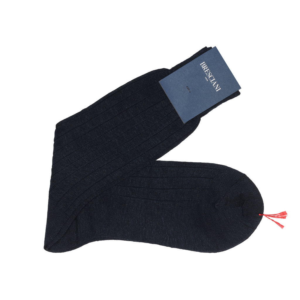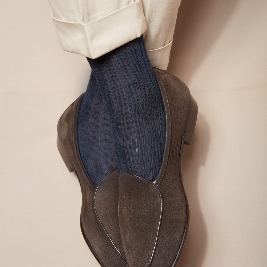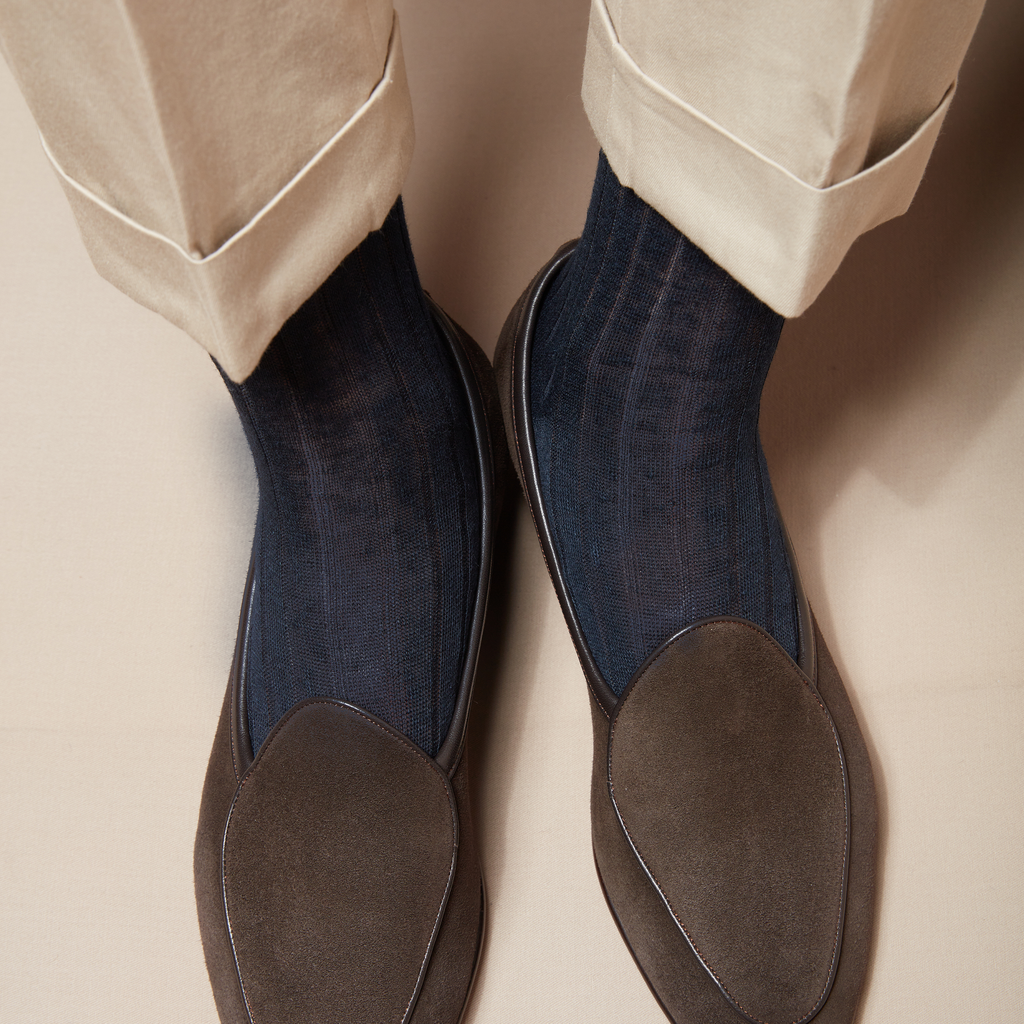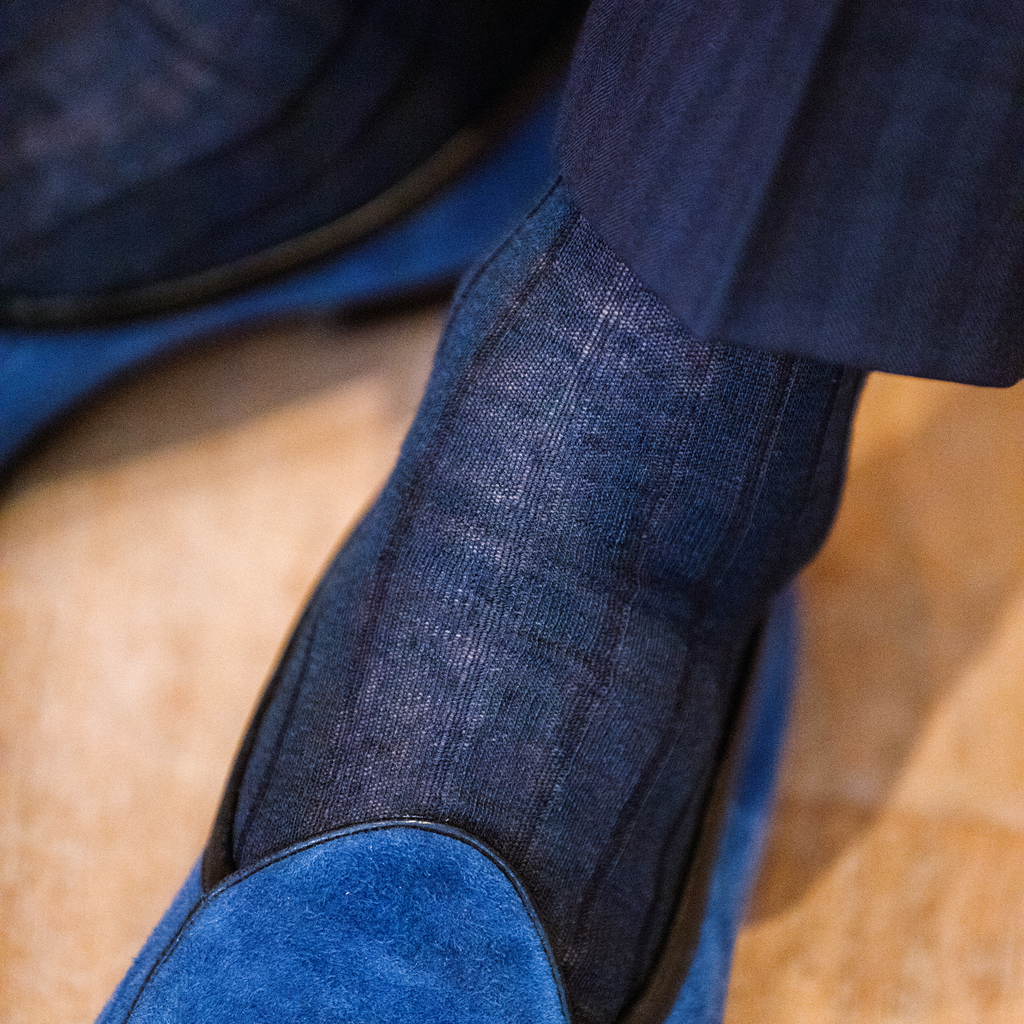 Ces chaussettes mi-hautes en lin sont d'un bleu assez profond et très facile à associer. Le lin est particulièrement agréable quand il fait chaud puisque les vertus anti-transpirantes du lin sont excellentes. Vos pieds seront ainsi bien habillés et au frais dans ces chaussettes en lin. Le bleu marine s'associe très aisément avec toutes les tenues.