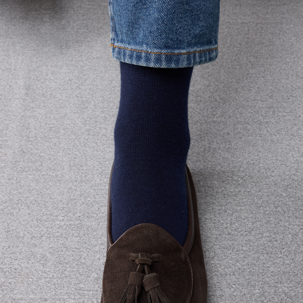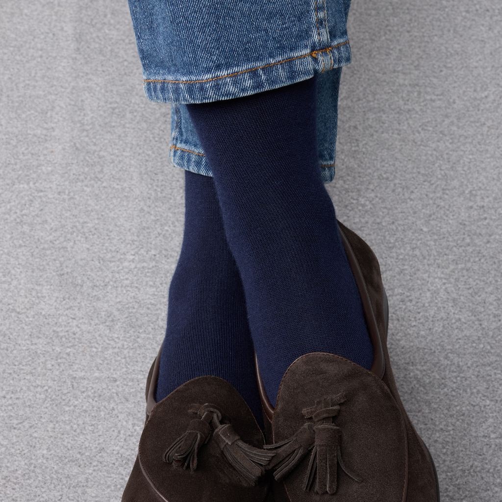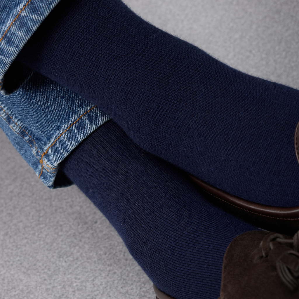 Cette paire de chaussettes hautes se distingue par sa teinte bleu marine intemporelle, élégante et facile à porter. Discrète et raffinée, elle s’intègre naturellement dans une tenue formelle comme dans un ensemble plus décontracté. Le bleu marine s’accorde parfaitement avec des tons gris, noirs ou marron, tout en se mariant également très bien avec des couleurs plus claires comme le beige.
