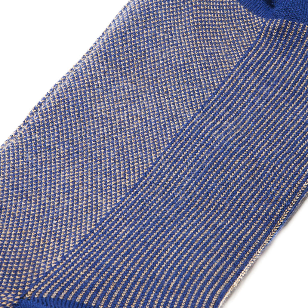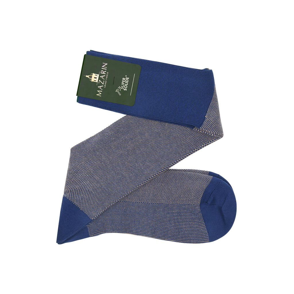Ces mi-bas (chaussettes hautes) sont d'un sublime motif caviar, de légers points couleur sable tricotés sur une chaussette bleu. Elles sont très résistantes à l'usure et aux frottements grâce à leur composition : du polyamide est ajouté au fil d'Écosse pour donner aux chaussettes cet aspect très robuste. Leur solidité a été testée par le test d'usure Martindale.