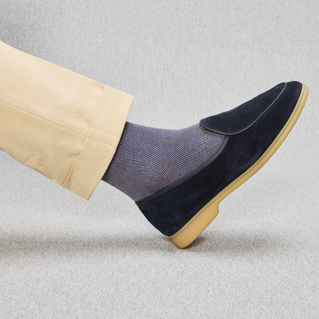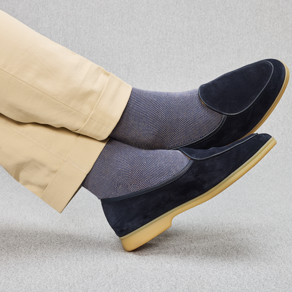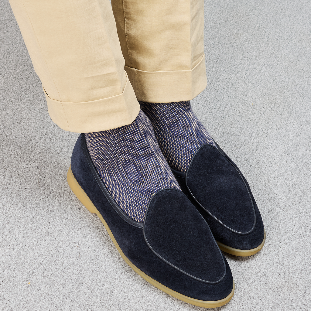 Ce motif caviar s'associera très bien avec des pantalons bleu marine, gris ou encore beige si vous voulez faire ressortir le détail de vos chaussettes avec élégance ! Portez-les avec des baskets pour un effet casual chic.