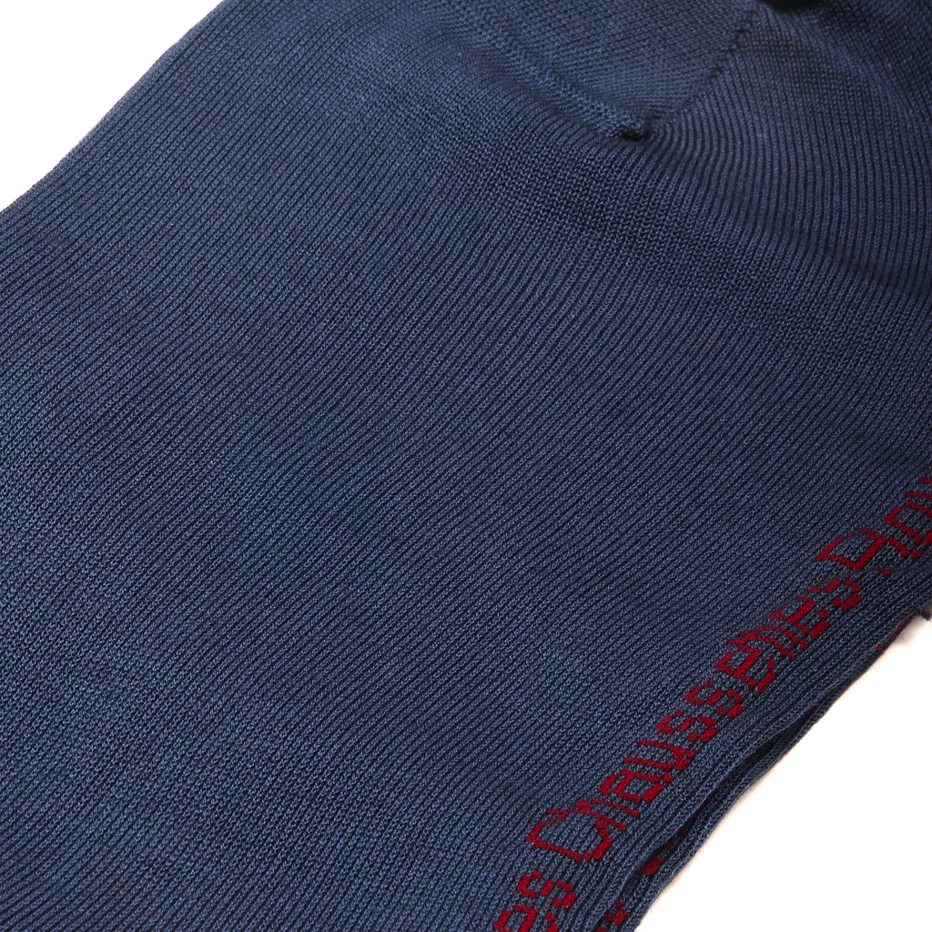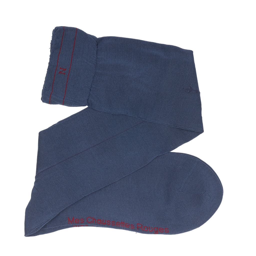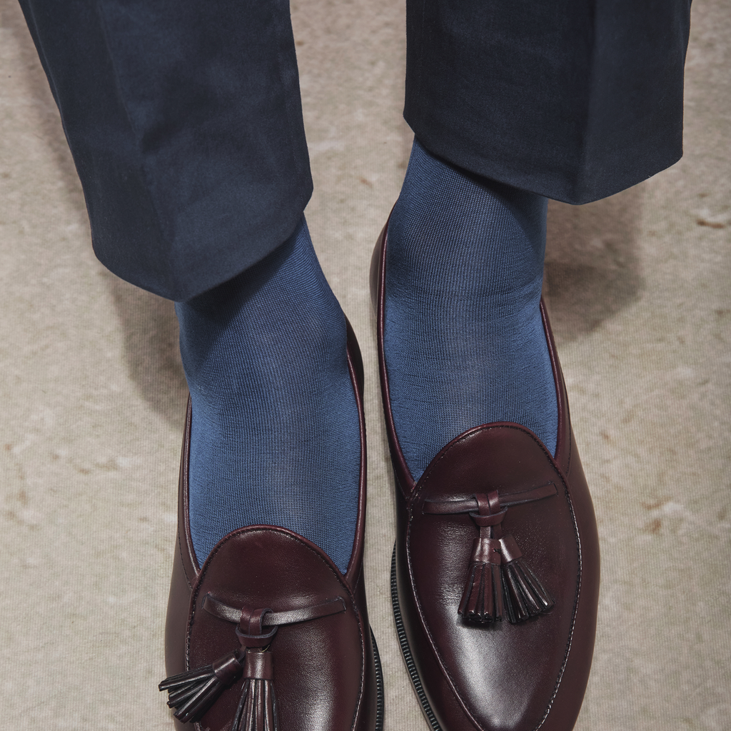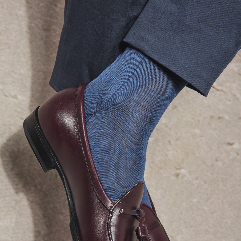 Découvrez la paire de chaussettes hautes en pur fil d'Écosse de couleur bleu acier, répliquée de la paire de bas ayant été portés par l'empereur Napoléon Ier.