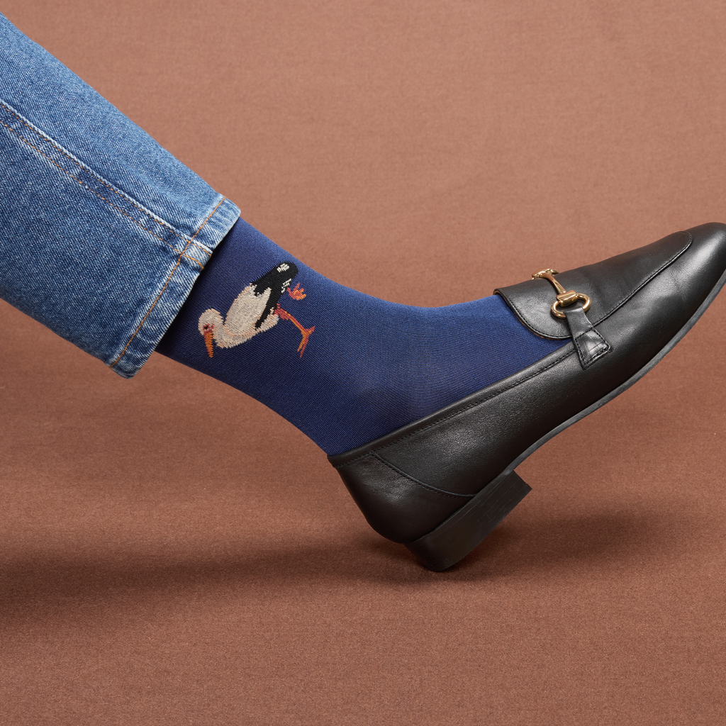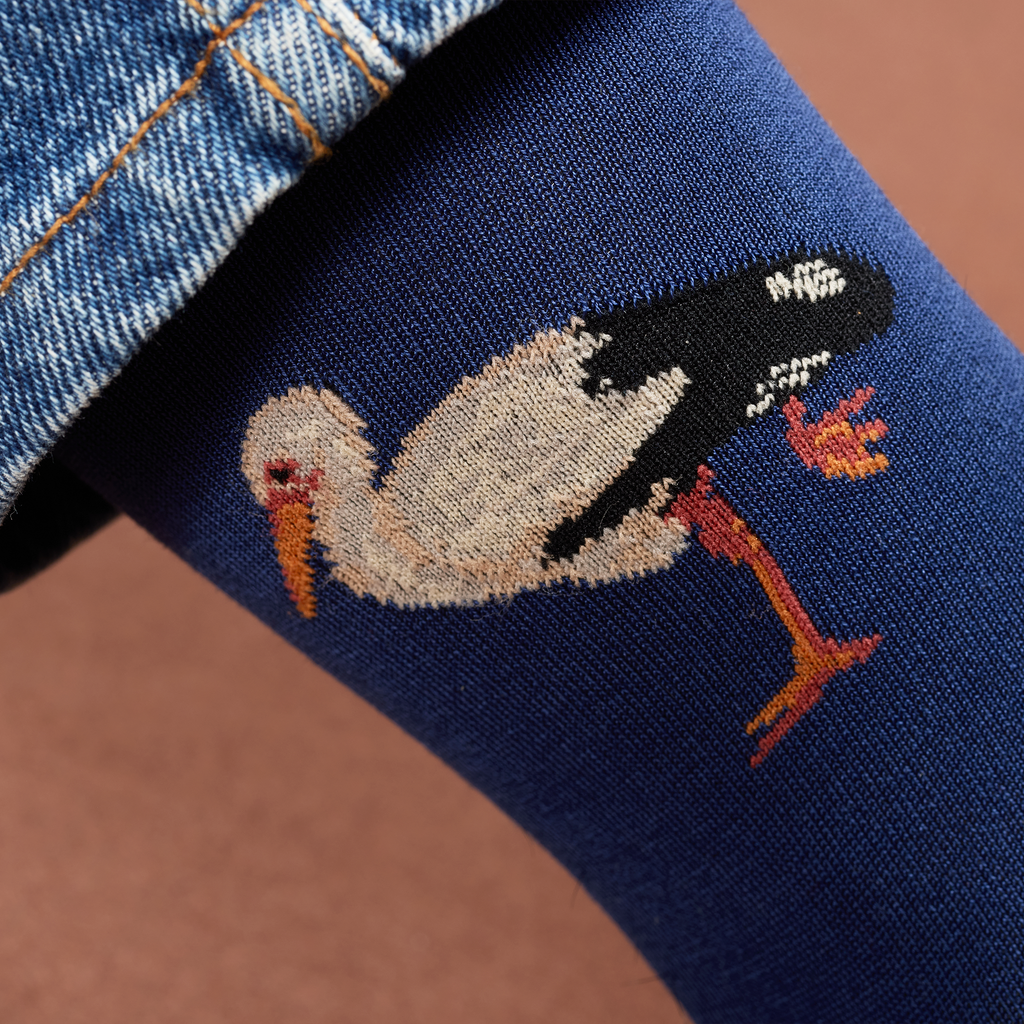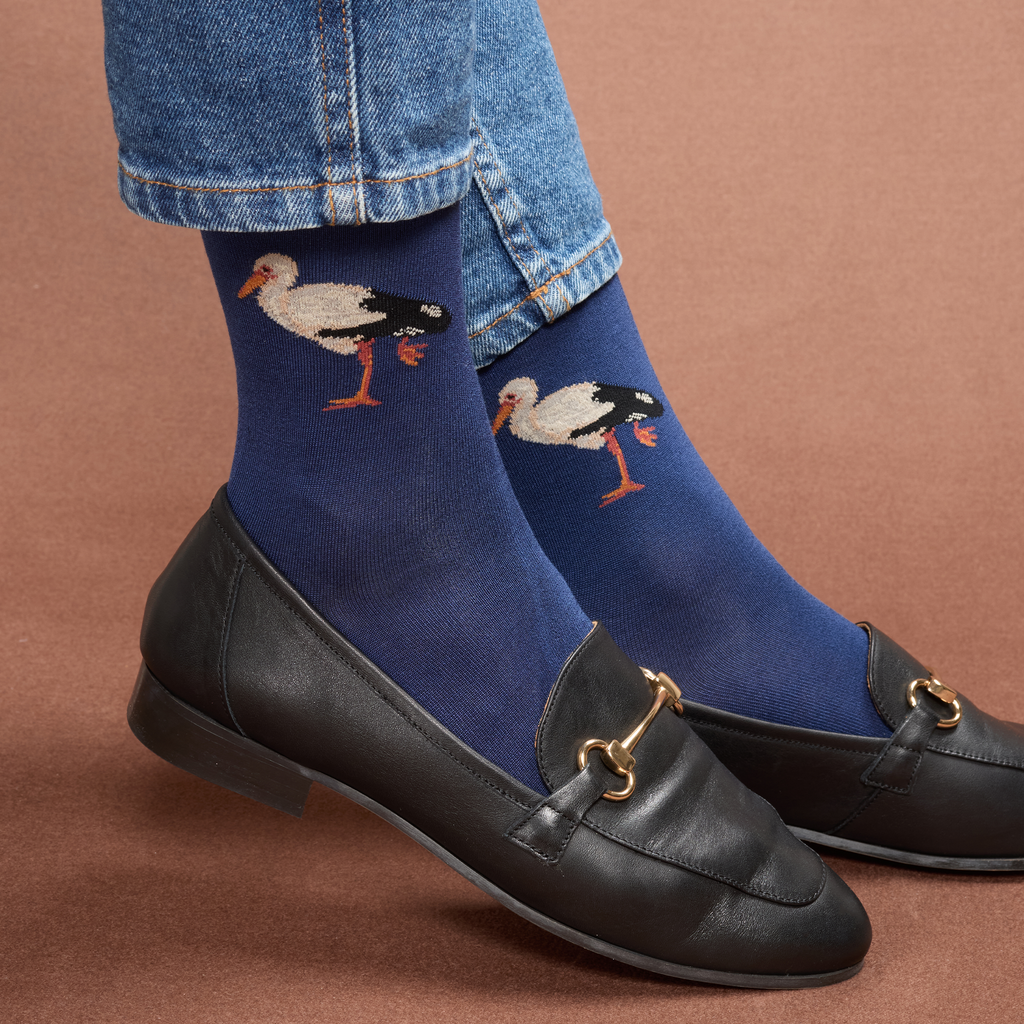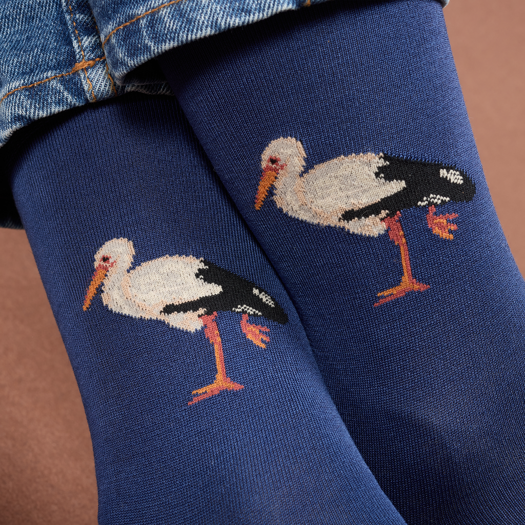 Chaussettes en coton pour femme de la marque Daphné, au motif de cigognes sur fond bleu marine.