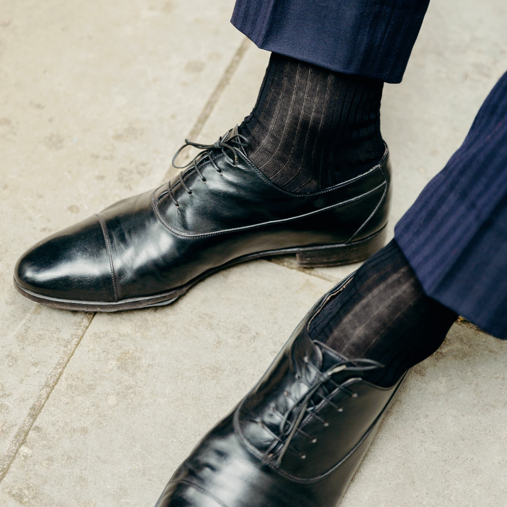 Avantages : elles ont plus de tenue et couvrent le tibia en entier. Leur hauteur est adaptée pour être portée avec des pantalons de costume.