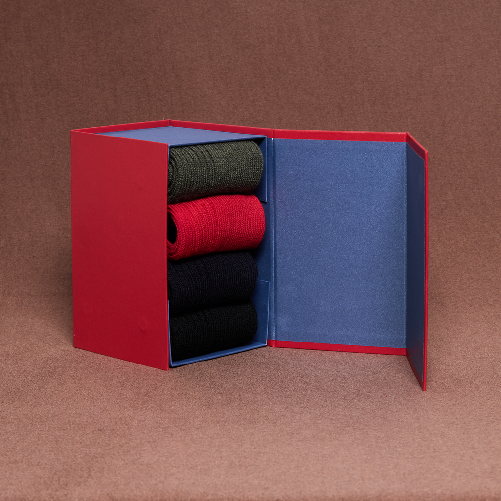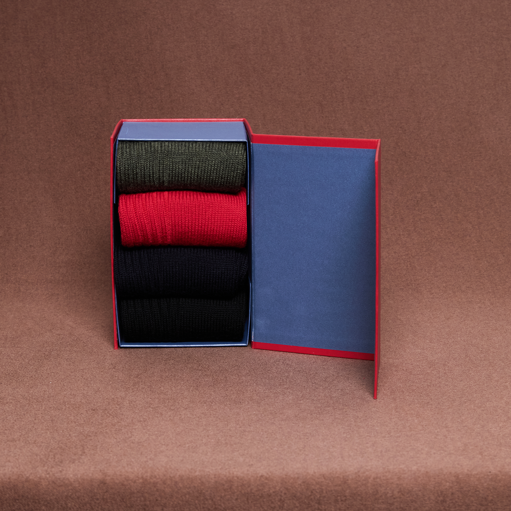 Passez les saisons froides en restant bien au chaud avec nos chaussettes en laine épaisse ! Cet élégant coffret rouge comporte quatre paires de mi-mollets de la gamme Bison, en laine super-solide :