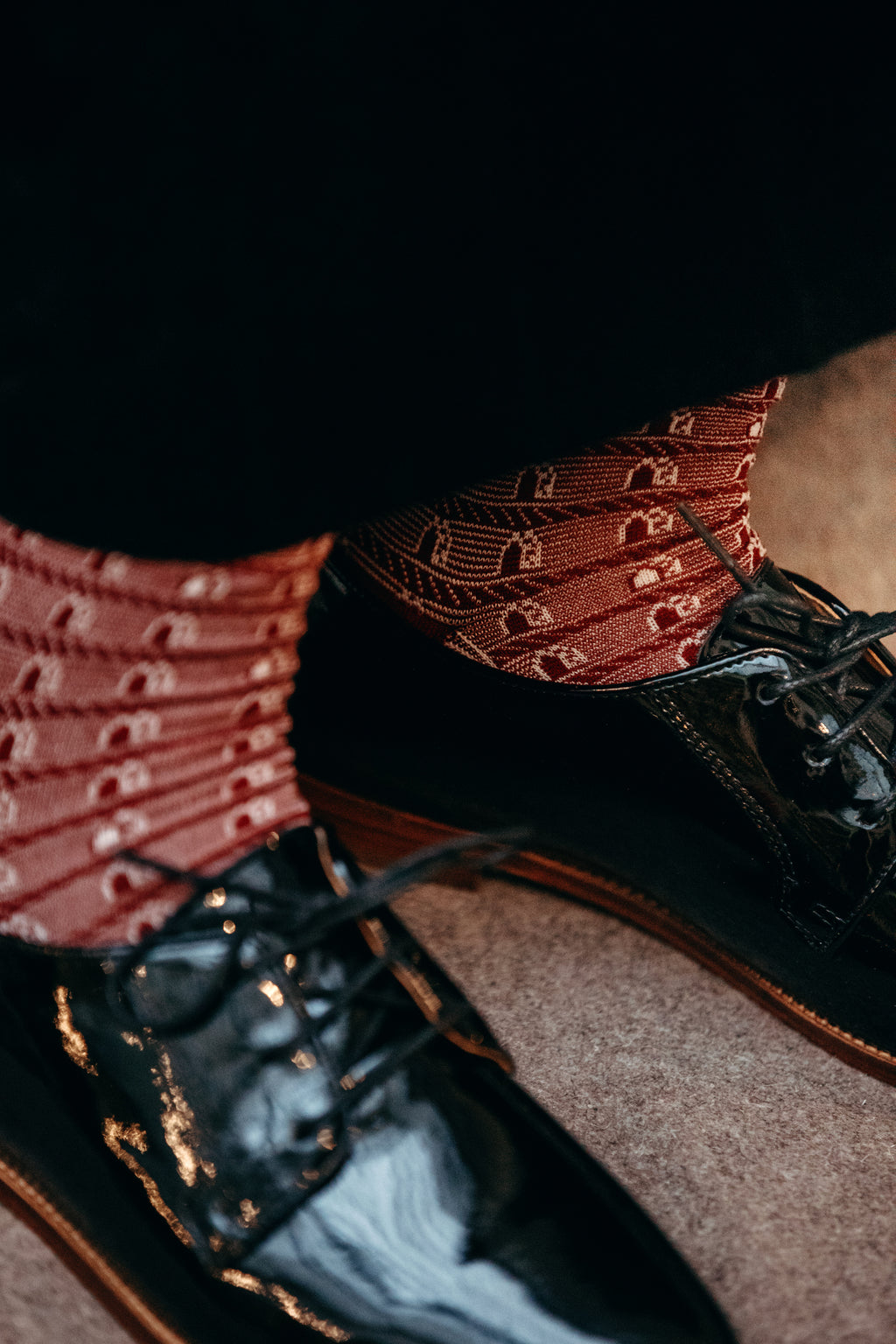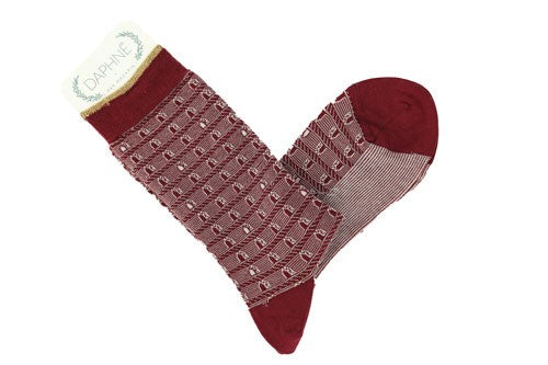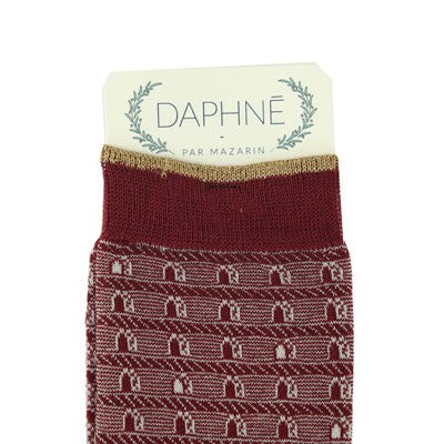 Ces chaussettes Daphné, couleur bordeaux et beige, sont fabriquées en Italie. Leur design a été inspiré du fameux Colisée à Rome, et reprend tout particulièrement leurs fenêtres arrondies.