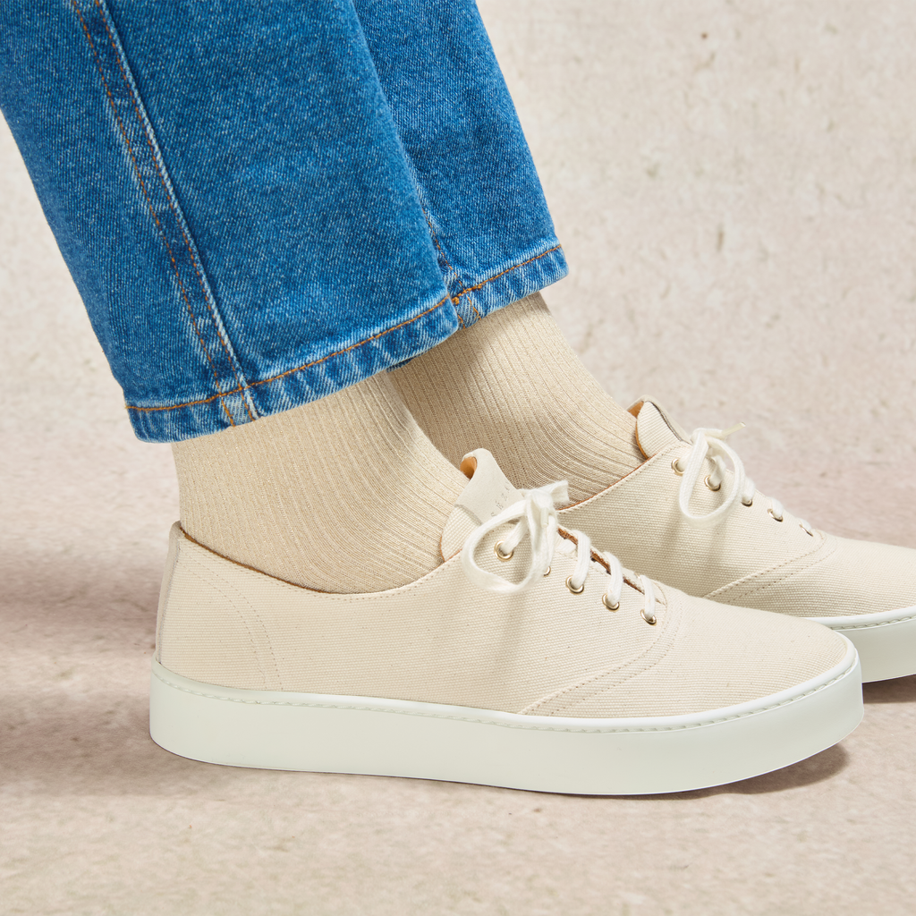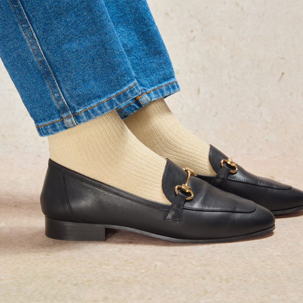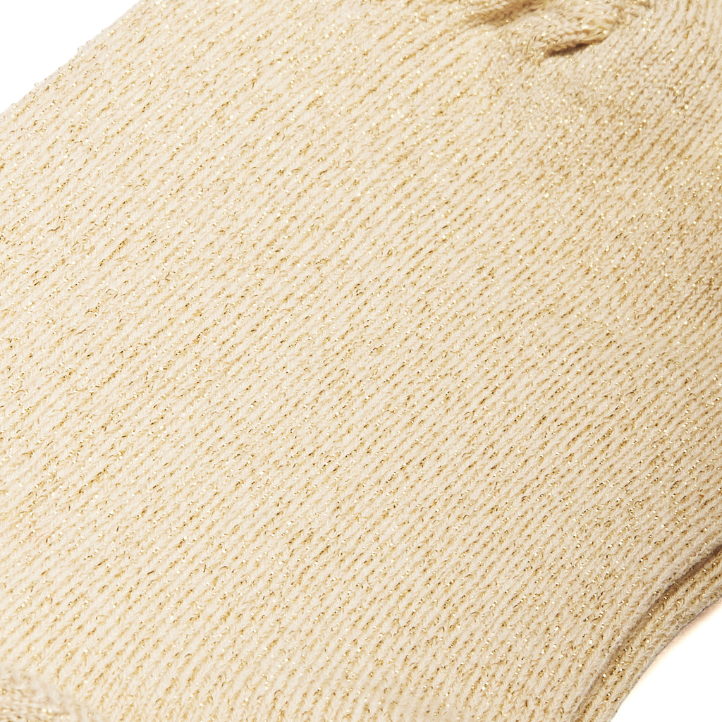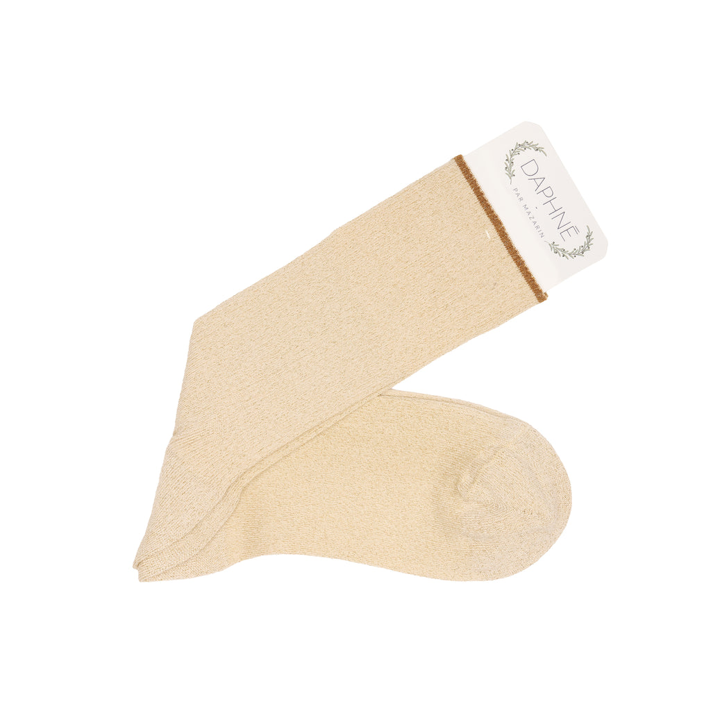 Sous un jeans, avec des tennis ou des bottines, voici une jolie paire de chaussettes couleur écru ! Ici, le lurex est doré et se fait assez discret.