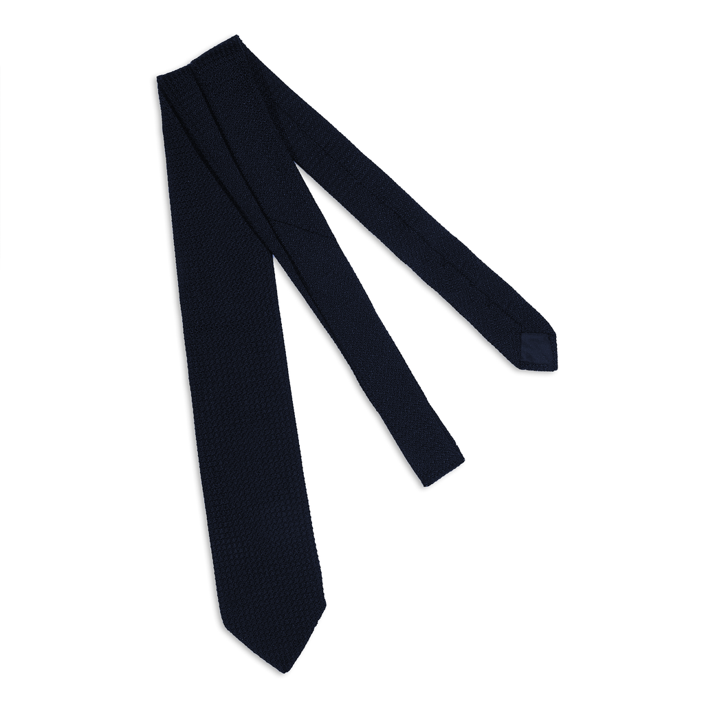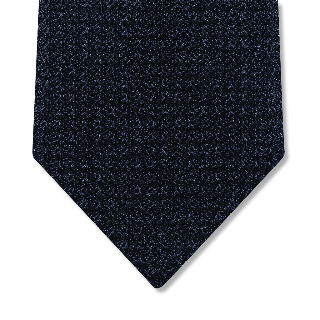 Ce modèle de cravate en grenadine de pure soie noire est élégant, sobre et plus original qu'une traditionnelle cravate noire en soie lisse. Le motif texturé s'associe aussi parfaitement à une tenue formelle. La triplure confère un beau tombé à cette cravate trois plis ainsi qu'une bonne souplesse.